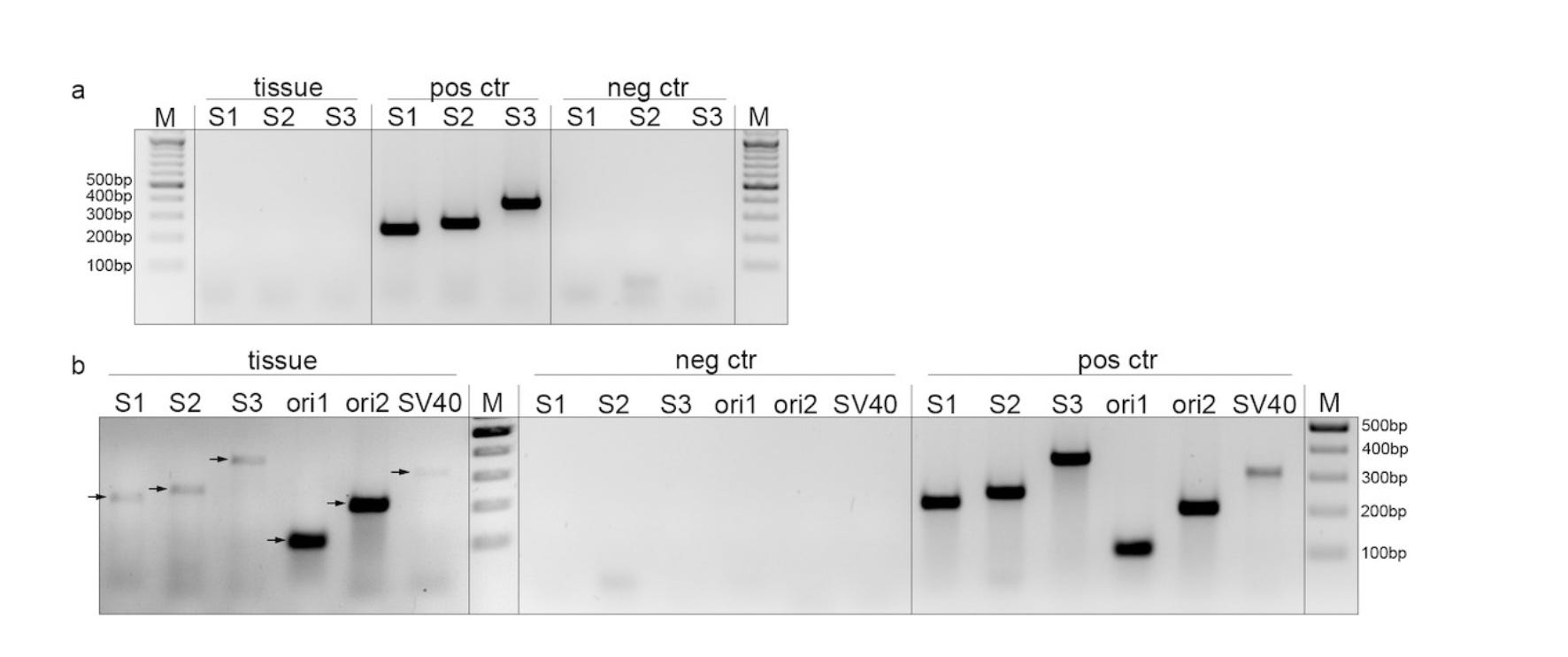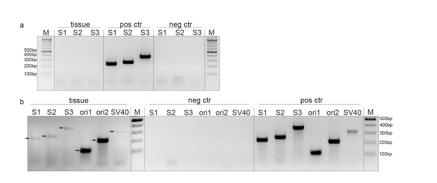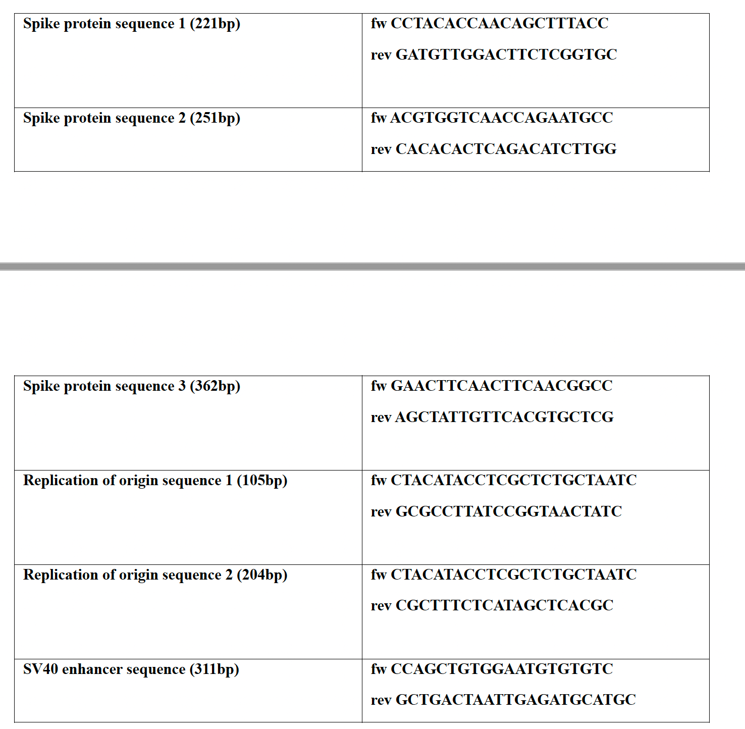 The Ori, SV40 and S2 primers I can find some human primer hits, albeit with mismatches and which need further scrutiny as NCBIs human genome is often contaminated with these vector sequences which are from the sequencing vectors people use in sequencing projects. They are mislabelled as part of human cDNAs because those cDNAs were sequenced from plasmids which contained those sequences and they were not fully removed from the database. I have not done this level of forensics as Figure 6B looks to have all 6 amplifying, albeit at very different intensities but of the expected size seen in the positive controls. Given all of the other clinical data they have corroborating spike expression, this is likely real.