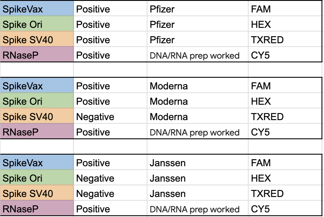 We would recommend testing for VaxSpike (FAM), VaxOri(HEX) VaxSV40enhancer (TXRED) and RNAaseP(CY5). This is a 4 color assay where the SV40 Enhancer provides the most sensitivity due to having 2X the copy number in the vaccine. The SV40Enhancer is also only present in Pfizer so SV40 target failure with Spike positive qPCR would indicate Moderna vaccination and not Pfizer vaccination. The RNaseP assay is direct from IDT and used in C19 testing. This confirms you have DNA and RNA extracted properly from the tissue (internal control for qPCR). The VaxOri is present in both Moderna and Pfizer but not Janssen.
