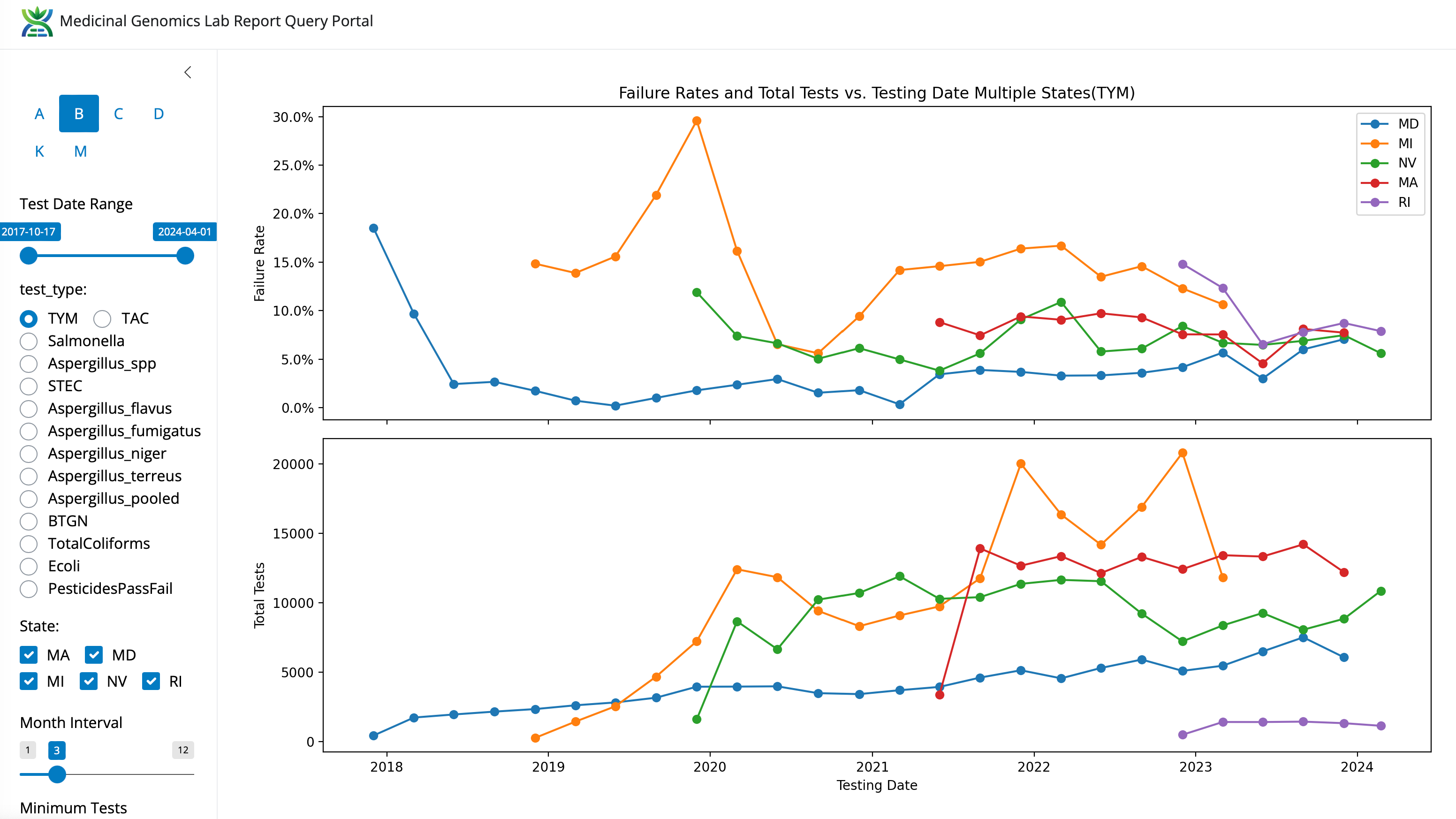 Figure 6. TYM and mold fail rates per state. Both MD and MI changed their recreational market TYM action limit from 10K to 100K CFU/g at different times.