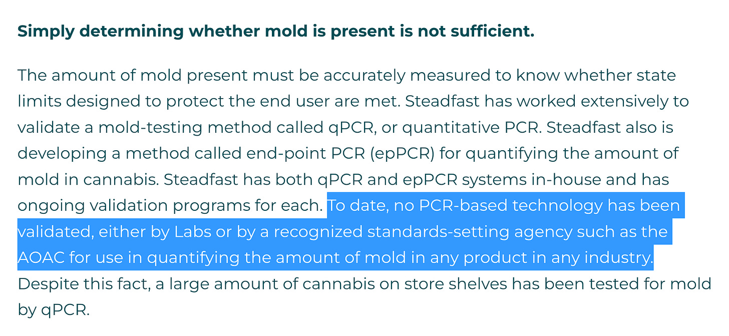 This is likely playing a role in the Viridis case against the MI-CRA as Viridis is challenging their competency in choosing a gold standard for declaring such a recall. Likewise there is a time delay from when Viridis tested the sample and when the MI-CRA tested it on the shelf. Both labs could be right and microbes simply grew on the shelf. The field needs shelf life testing to have any validity to such lawsuits.