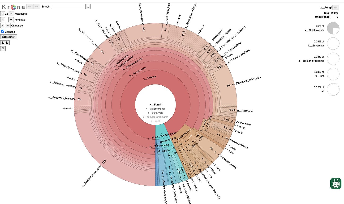 Figure 13. Fungal microbiome report from whole genome sequencing of sample Purple Kush-St-Flower from Zamir Punja. There are 70 Cannabis whole genome sequences which include their Bacterial, Viral and Fungal microbiome on Kannapedia.net