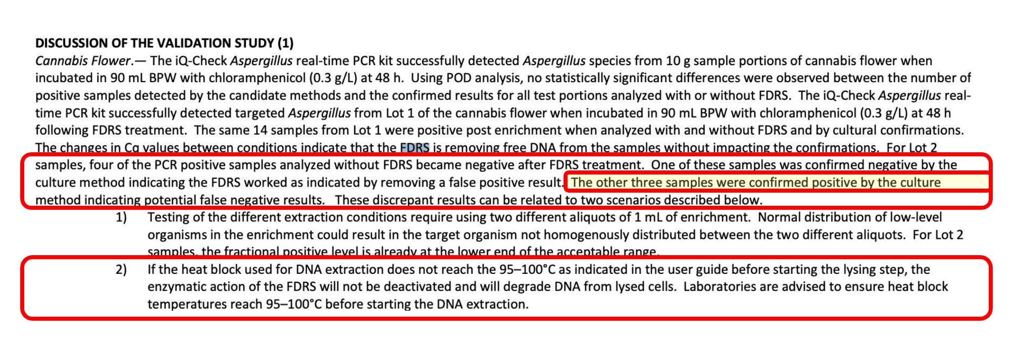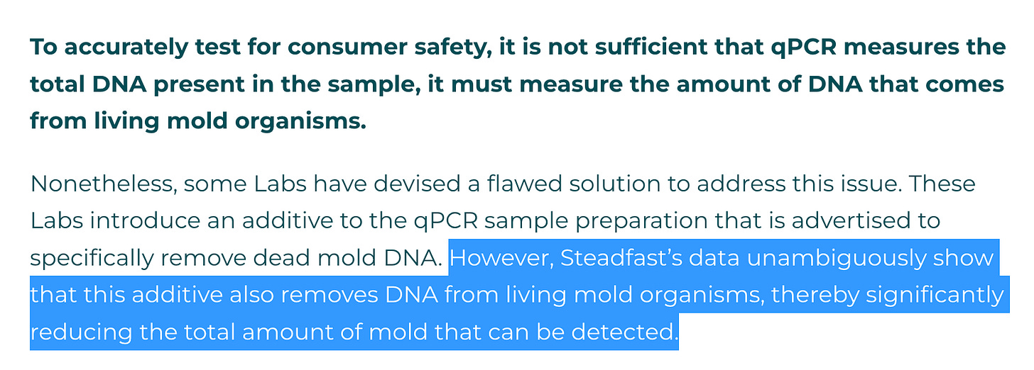 Depending on how this step was performed (freezing, ozone, microwave, H2O2 etc), you can kill the CFU viability but not kill its DNA and get qPCR systems to over call the samples. Steadfast believes these dead microbes are harmless. Many other microbiologists disagree as the dead microbes are a sign that mycotoxins and endotoxins are present (Eidem et al).