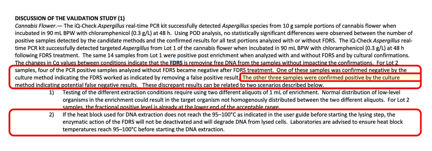 This felt like a cheat as they measured the truth set using culture and not surprisingly the culture based system had better agreement with culture. This is particularly true if you over homogenize, freeze or ozone treat/irradiate samples. These steps are not always present in normal cannabis samples and are less required in states with 100,000 CFU TYM action limits. Illinois is a better state to look at for remediated samples as their requirements are so low that many more people use remediation tools.