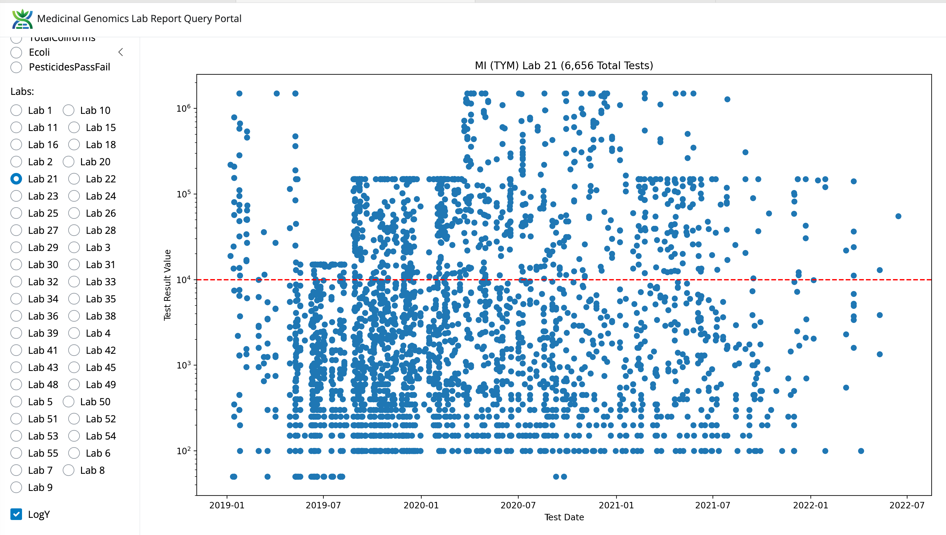 Michigan started with a 10,000 CFU/g TYM action limit which moved to 100,000 CFU/g TYM action limit around Feb-March of 2021. Around August of 2021, the lab switched methods to something that looks more culture based as the dynamic range narrowed. This is likely related to the Emergency AOAC study that was performed in the state that used a culture based system as a measurement of the truth set in Michigan.