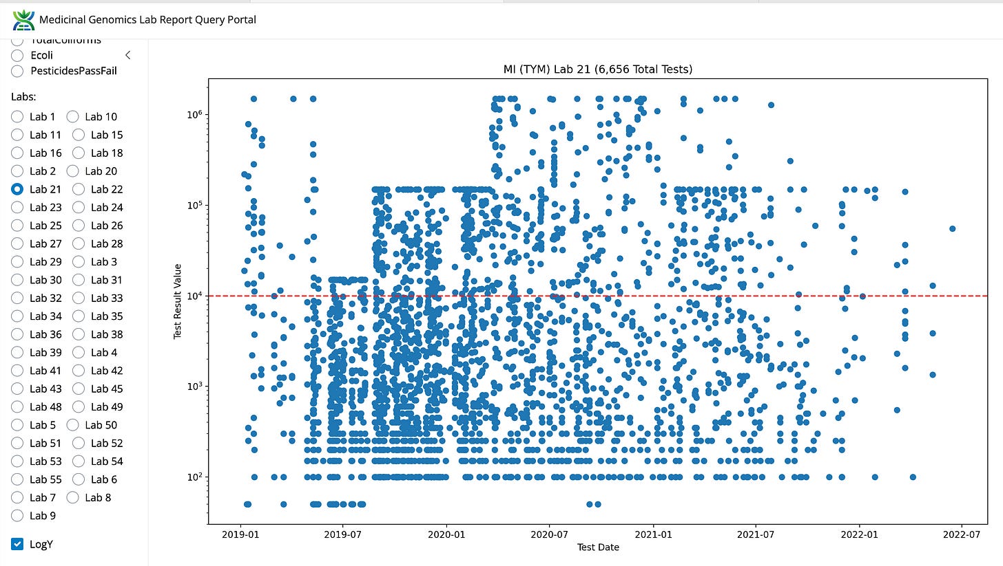The MI-CRA lawsuit was focused on Aspergillus failure rates (not TYM). In this case these labs do have low Aspergillus failure rates but they are not the lowest in the state. Their 2 labs combined are likely the largest volume of testing in the state. This does highlight a blind spot in AOAC certifications; they do not have LODs on microbial tests.