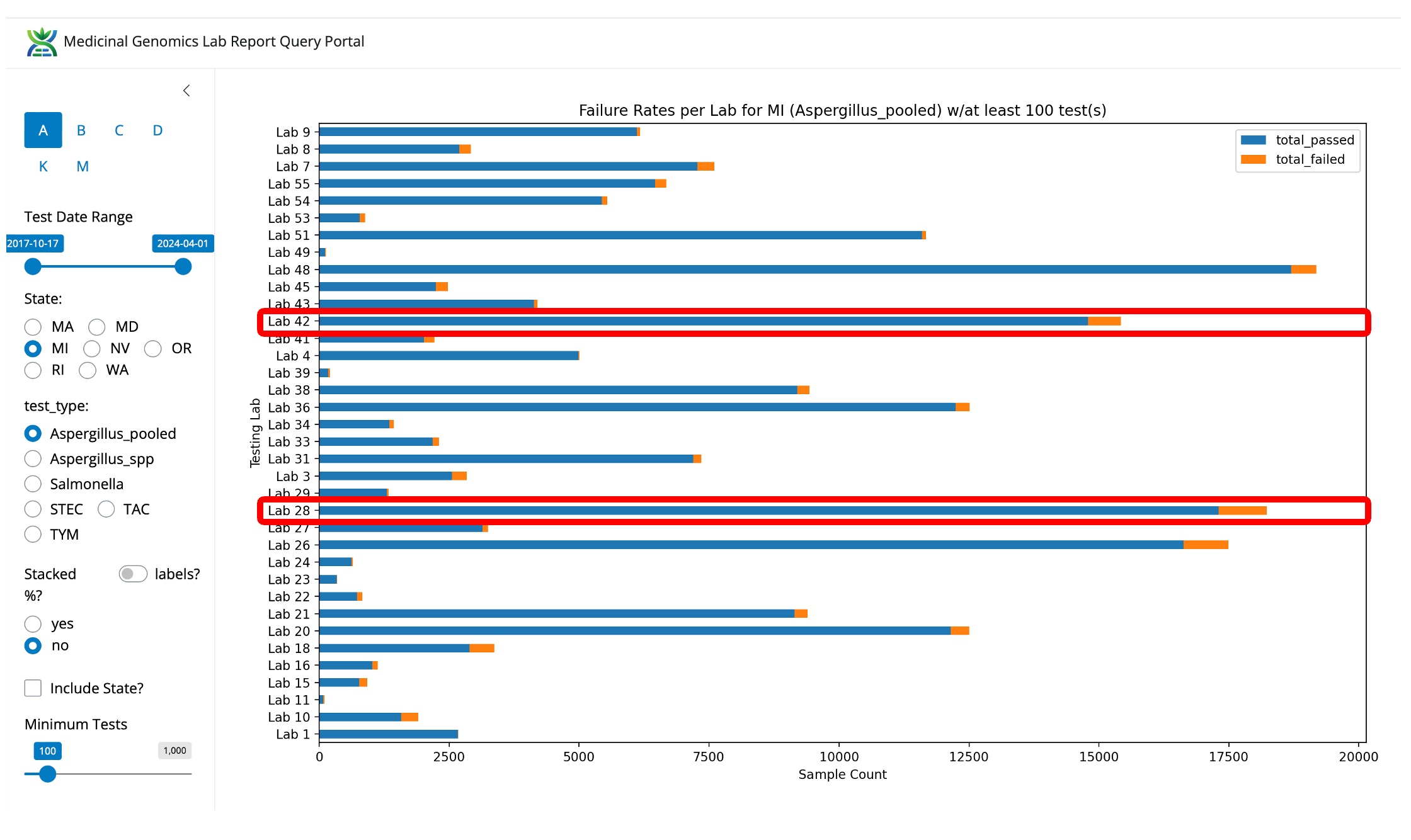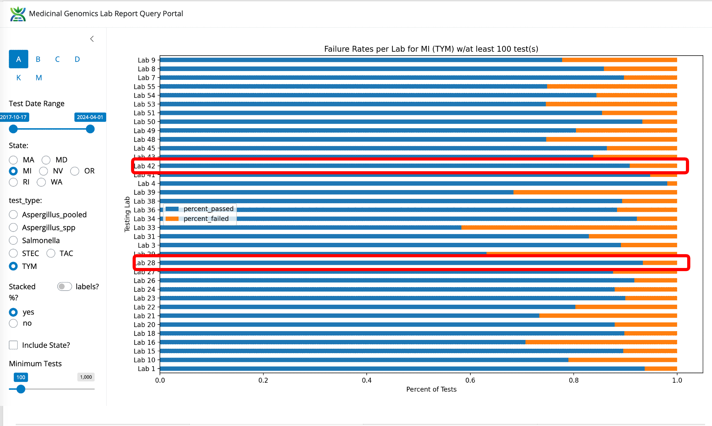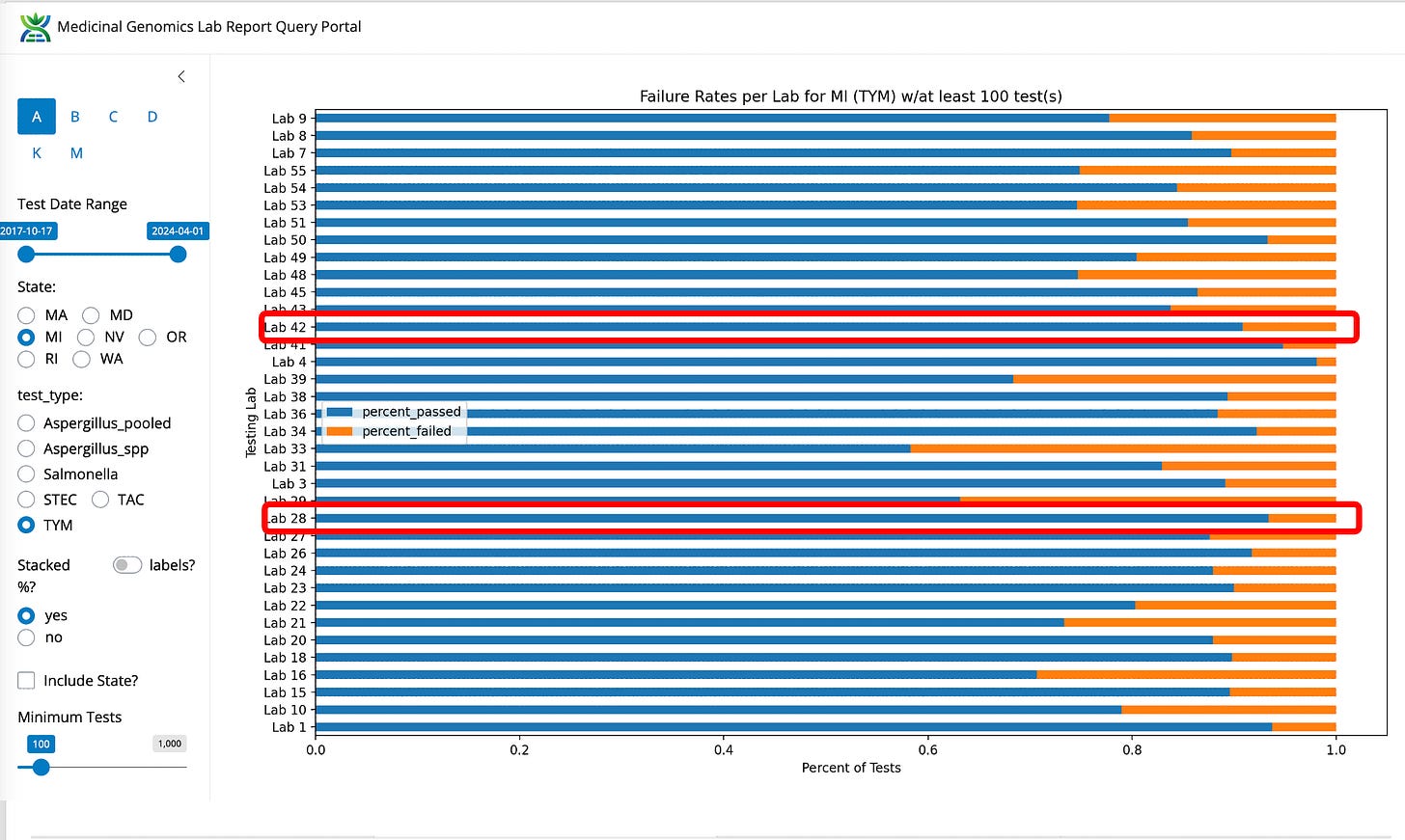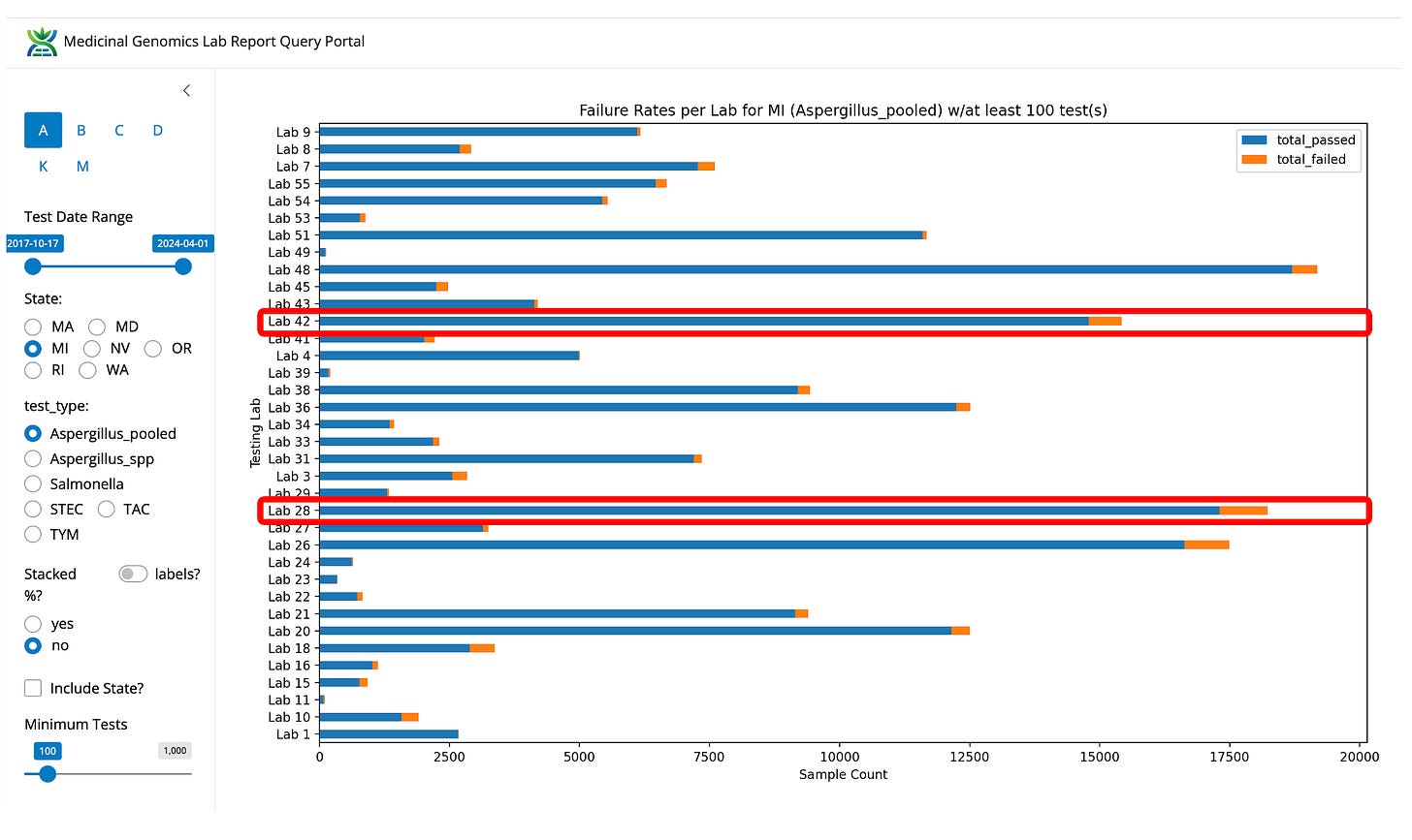 Figure 4- Aspergillus fail rates in Michigan by lab (not normalized). Viridis is not the lowest fail rate in the state but they are the highest volume and low fail rate lab.