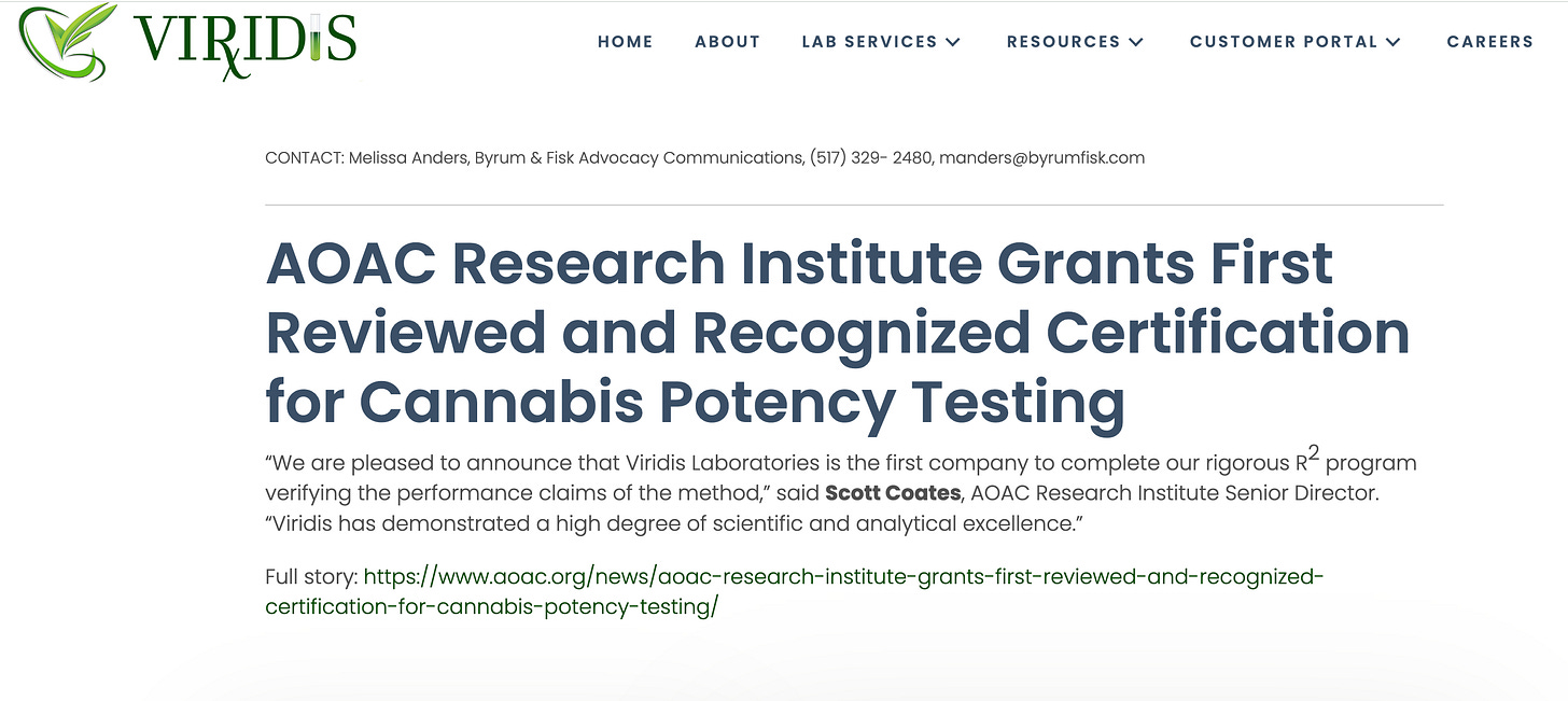 This certification was used to push back on the regulators questioning their THC values. Over 80% of the flower samples that were over 30% THC were from Viridis. This is an outlier result the state had to act on. This triggered a deep investigation of the Viridis AOAC approved method and triggered many letters to be sent into to AOAC to warn them of mathematical errors in the method. AOAC eventually withdrew their certification of the method.