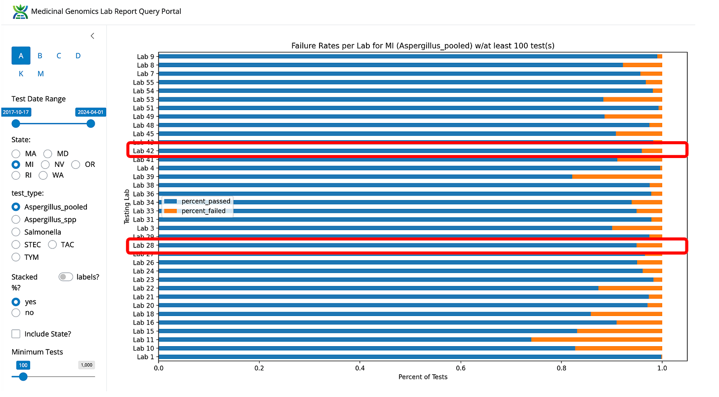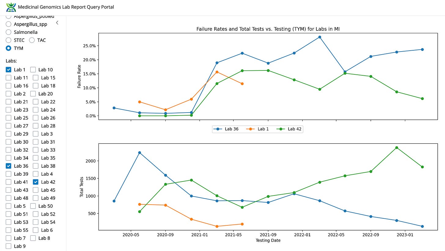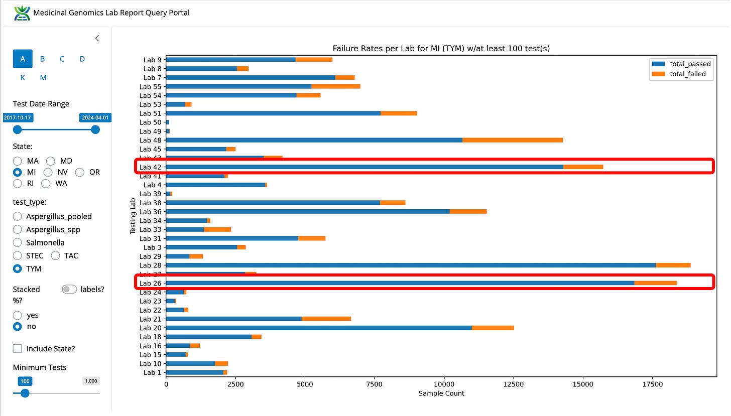 What likely triggered the MI-CRA to take action against Viridis, is that this lab happens to have the highest testing volume in the state and the lowest TYM failure rate. Lab 42 and 28 are noted as LN (Lansing) and BC (Bay City) in the notes section of the Michigan data (graciously provided by Yasha Kahn but the BC and LN assumptions are my own based on their court documents).