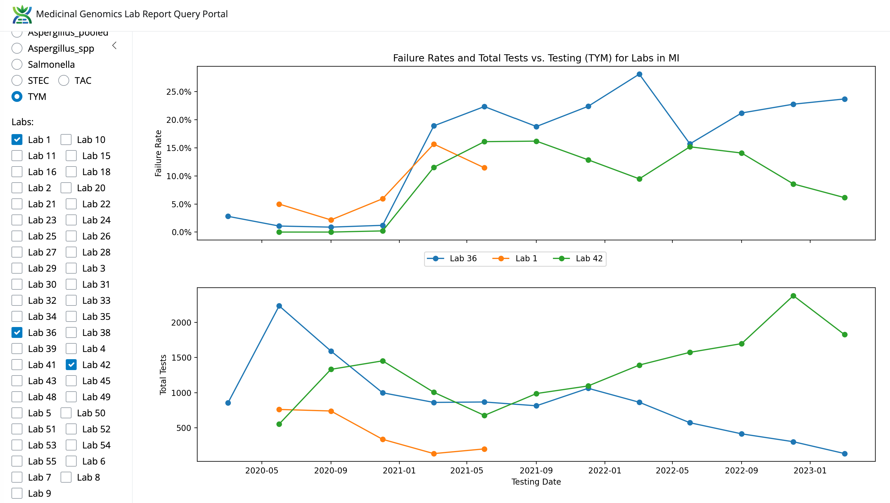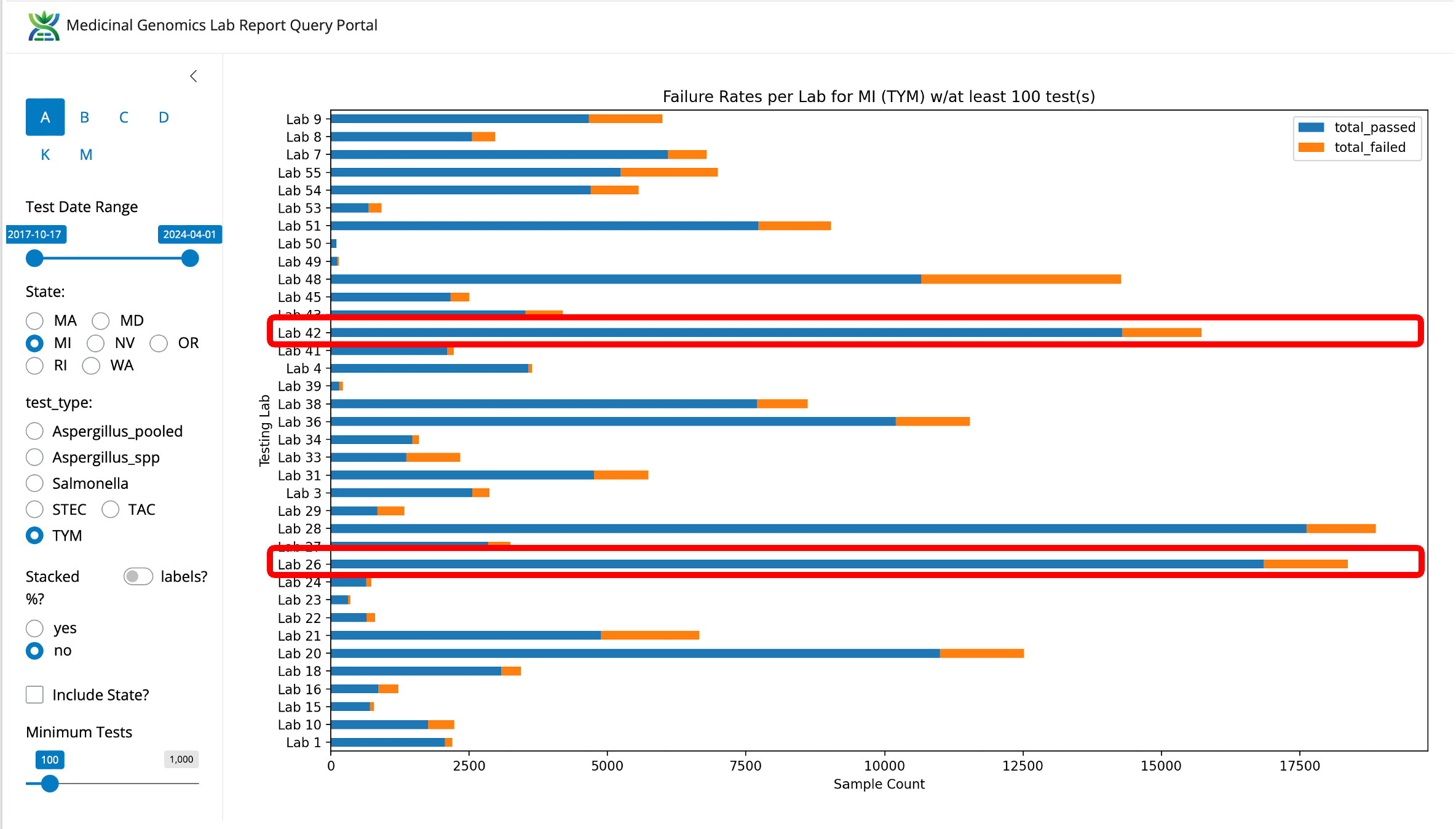 Figure 2. TYM fail rates for the State of Michigan by Lab (not normalized).