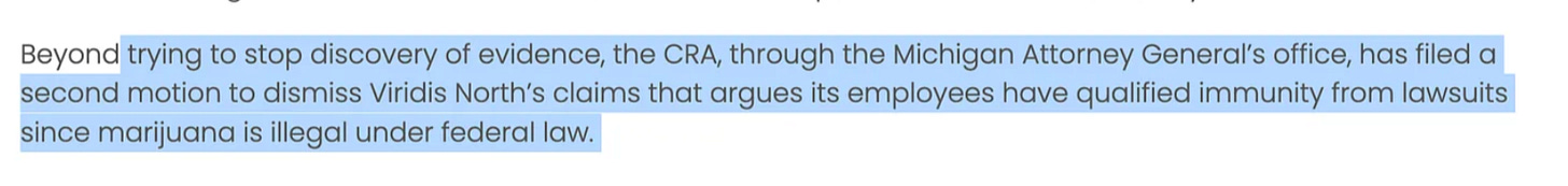 The MI-CRA is claiming no liability and thus no discovery via qualified immunity since Cannabis is federally illegal.