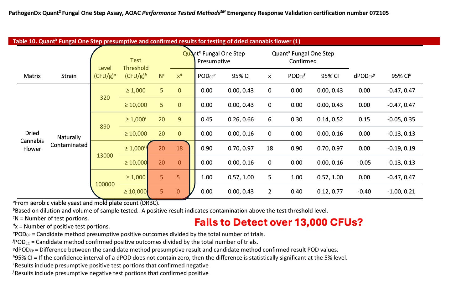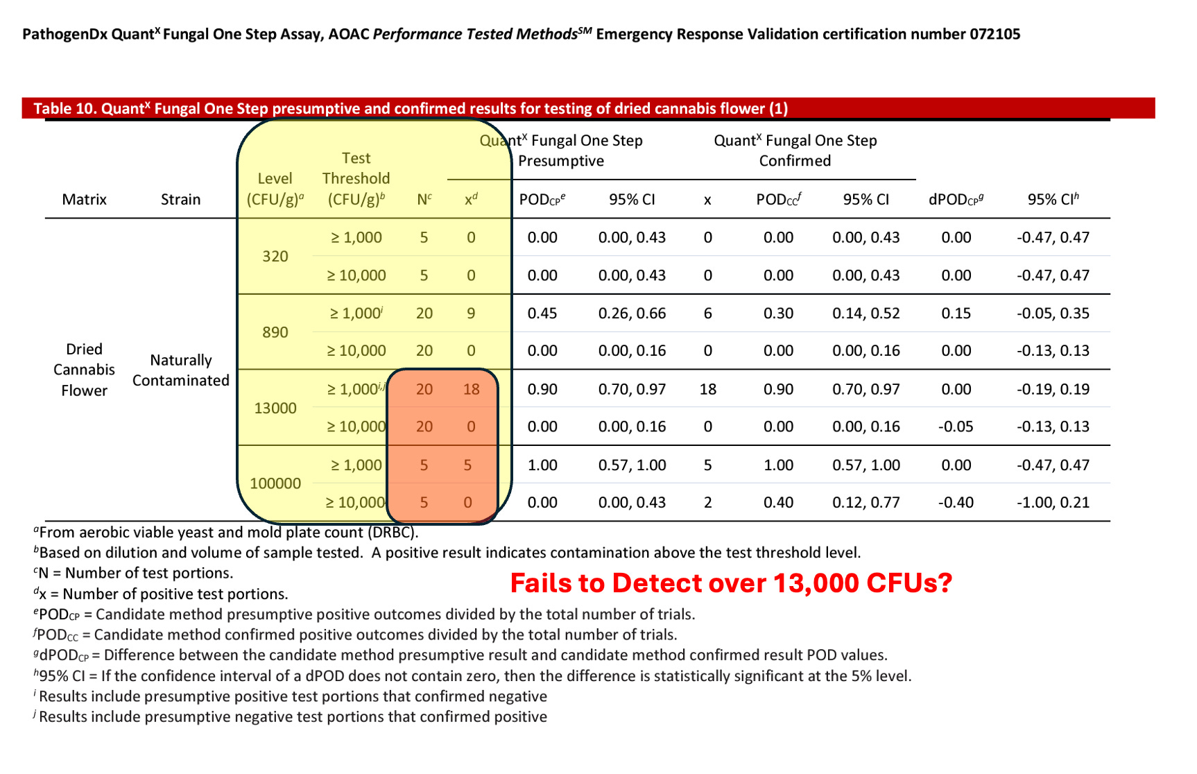 The AOAC certification for this platform appears to confirm it cannot detect over 13,000 CFUs/g