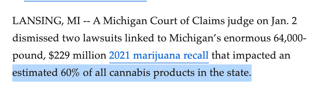 Michigan has their largest cannabis testing lab (Viridis) suing the regulators over a $229M recall the MI-CRA declared. In both OR and MI suits, the consumer loses.