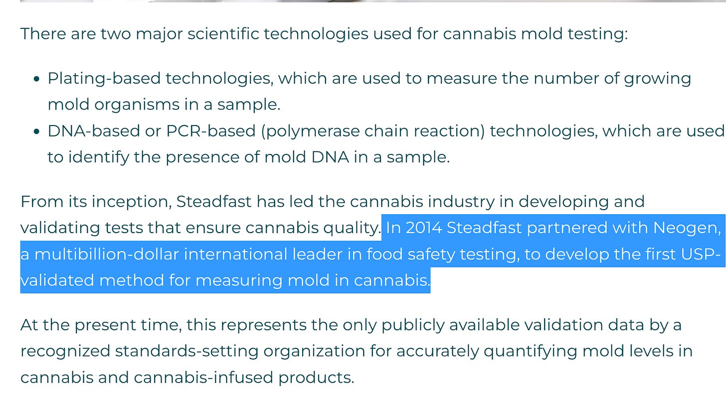 When the study completed the data showed that at least one qPCR kit (Medicinal Genomics) was counting more CFU/g than plating! Despite this, plating was declared to be the victor in the study likely because the study was centrally organized by a lab with a Neogen partnership (Steadfast labs). The study was organized with culture based methods assumed to be the gold standard that everything had to be benchmarked to (more on this below).