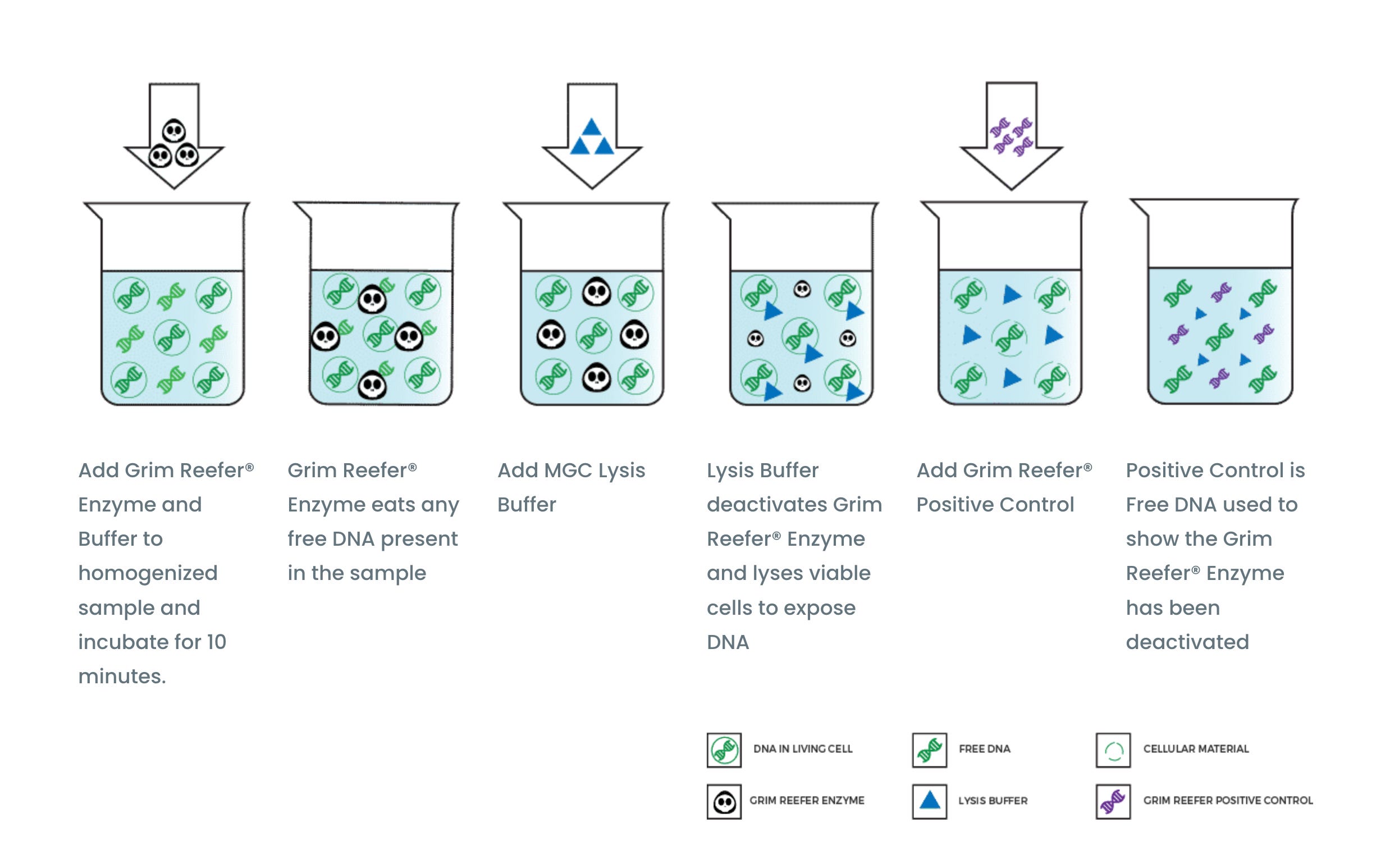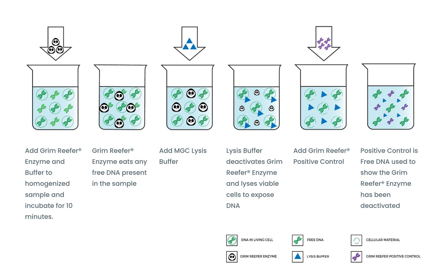 As a result, qPCR systems need an enrichment or a live-dead discrimination tool when used with irradiated products. Some methods simply grow the samples for 10 doublings (1000 fold more microbes) and then dilute the sample 1000 fold to dilute out the dead DNA before qPCR. The viable microbes replicate and the DNA stays at the same concentration or is consumed by the microbes under growth. This is termed Enrichment and in some states is mandated on tests that have low action limits. Our Aspergillus tests have an Enrichment process built into them as they are low action limit tests. at 10,000 CFU/g and 100,000 CFU/g Enrichment can be replaced with Grim Reefer (DNase method) to save time.