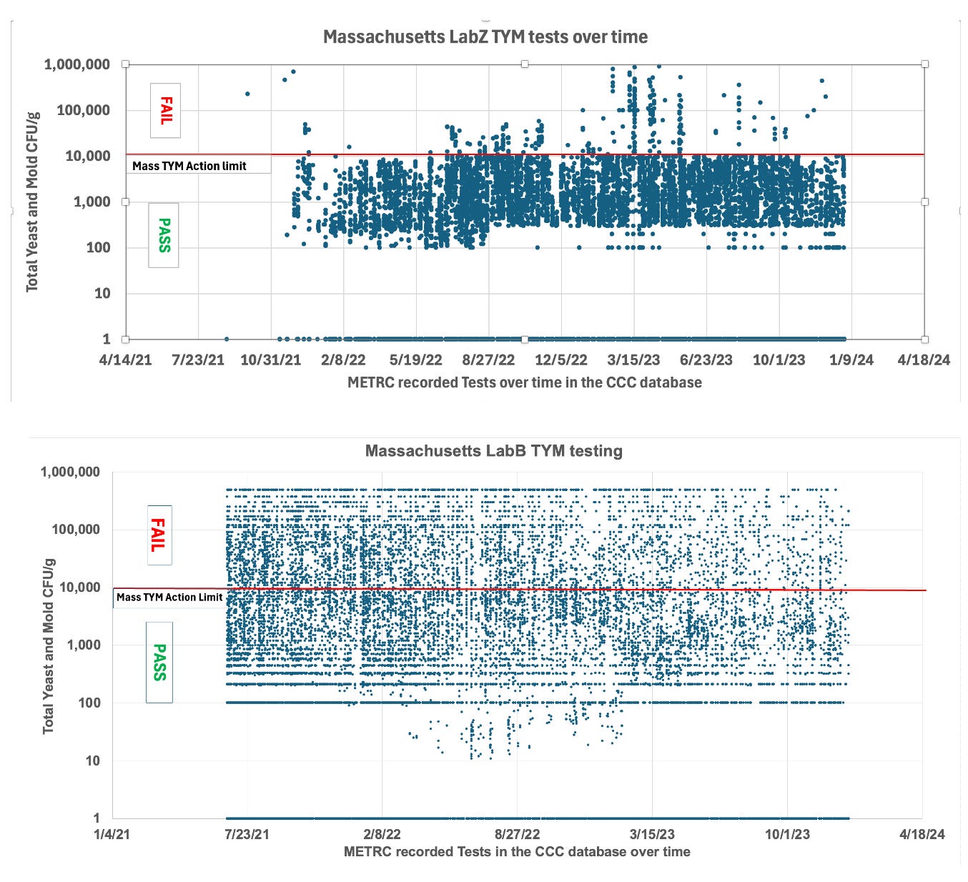Figure 9. TYM data from Massachusetts from LabZ and LabB. LabZ shows an unnatural distribution of CFU/g.