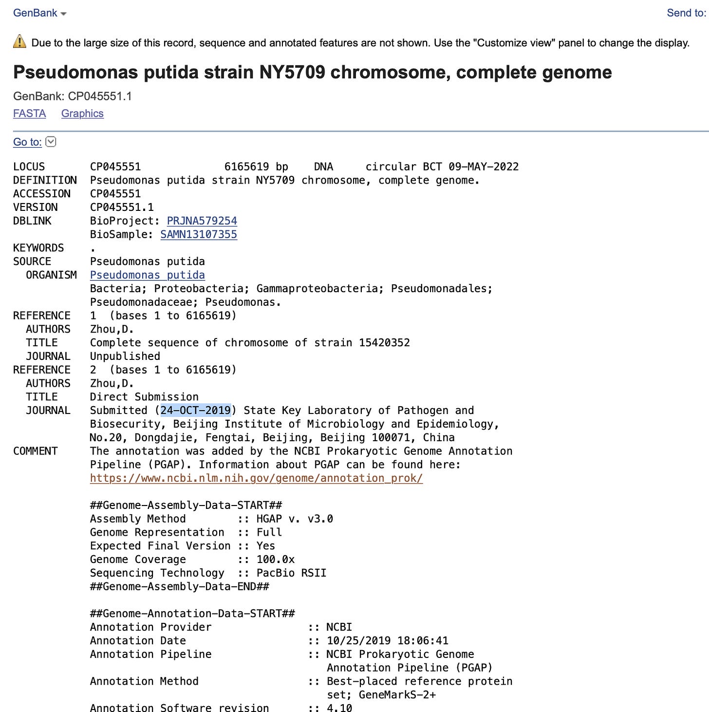 Oddly, a small contig that has 2500X coverage aligns to another pseudomonas putida submitted by this same lab in Oct 2019.