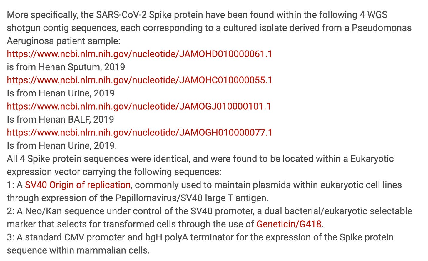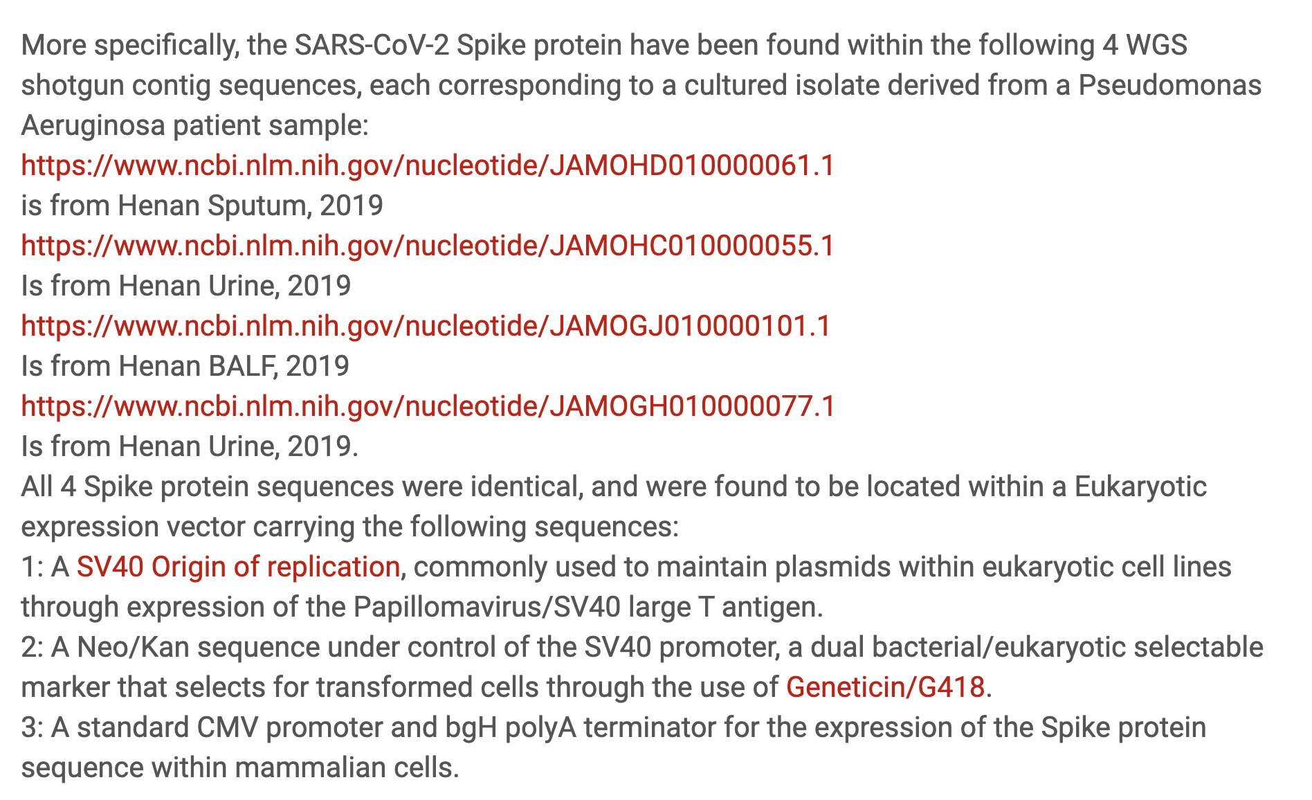 Given the large gap in collection time to NCBI submission and the fact that this time interval traverses the Zoonosis theory born on date of SARs-CoV-2 in Dec19 , this sequence becomes pivotal to the origin debate. The spike protein is 100% identical to the amino acid sequence of C19 spike minus the 4 critical A.As in the FCS. There are some mods on the 5’ end and the 3’ end of the spike protein that are interesting. The nucleotide sequence is 73% identical to the virus and 88% identical to BNT162b2 and mRNA-1273. This implies codon optimization occurred and there is no question that this spike is man made as its in a commonly used E.coli/Mammalian expression vector.