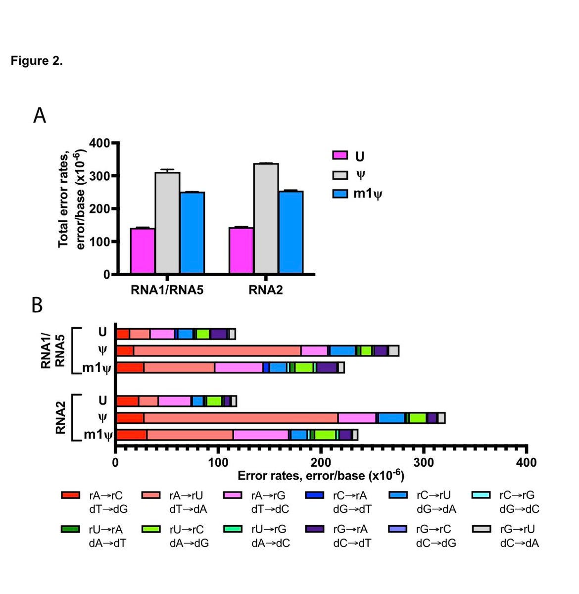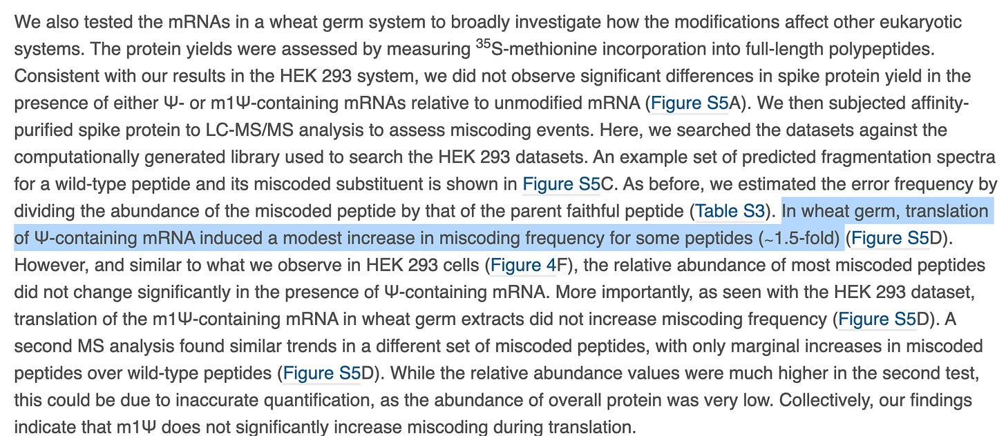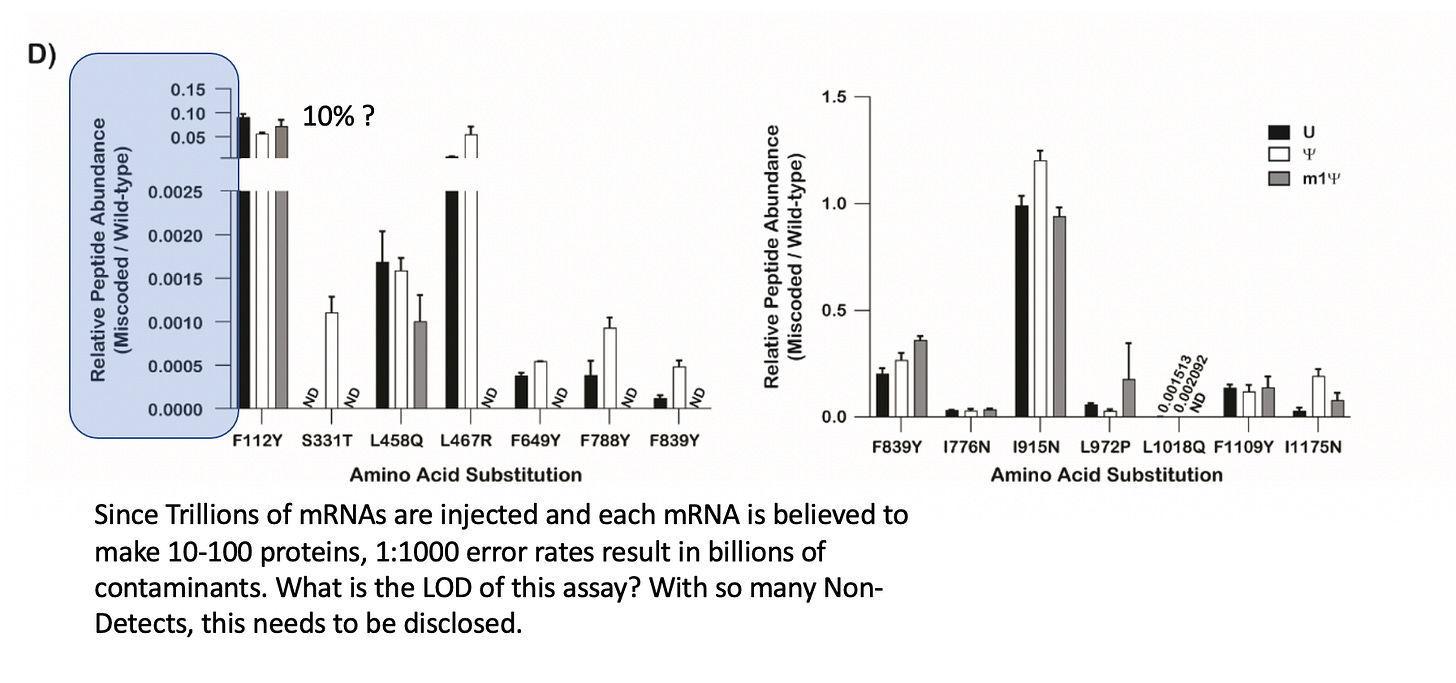 These author see a 1:6,000 error rate (~130-300/Million) and this error rate escalates (1:3000-1:4000 )with the substitution of Pseudouridine or N1-methyl pseudouridine. The vaccines are ~4,200 bases in length so this implies 1 error in every vax molecule and you are injected with 2 shots at minimum which amounts to ~13T-134Trillion of these molecules with vaccination (30ug Single use Pfizer shot vs 300ug (3X Moderna shot). Of course, some people get addicted to these needles and have taken 4 or more shots but I think they represent a very fringe minority of hypochondriacs to extreme virtue signaling politico’s.