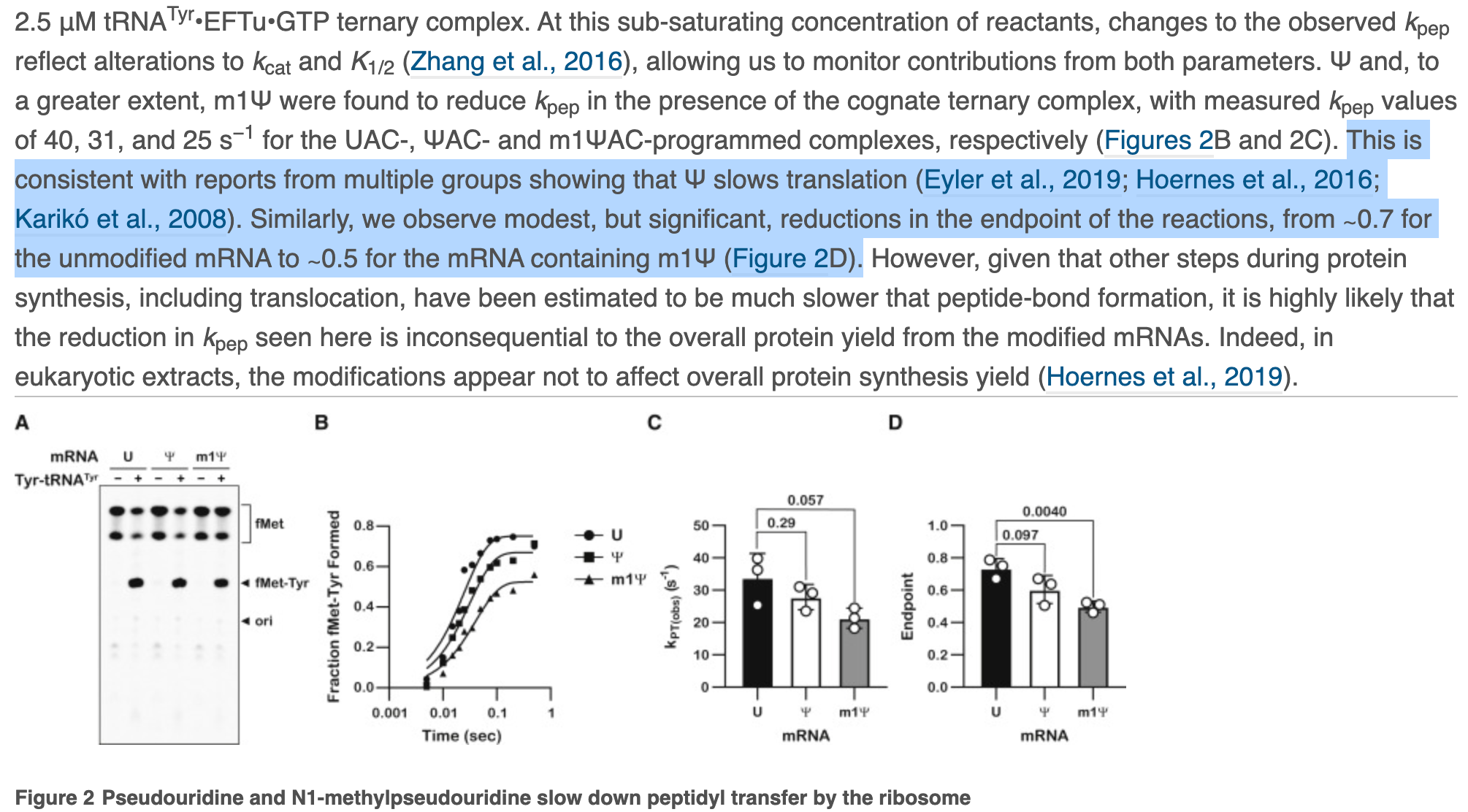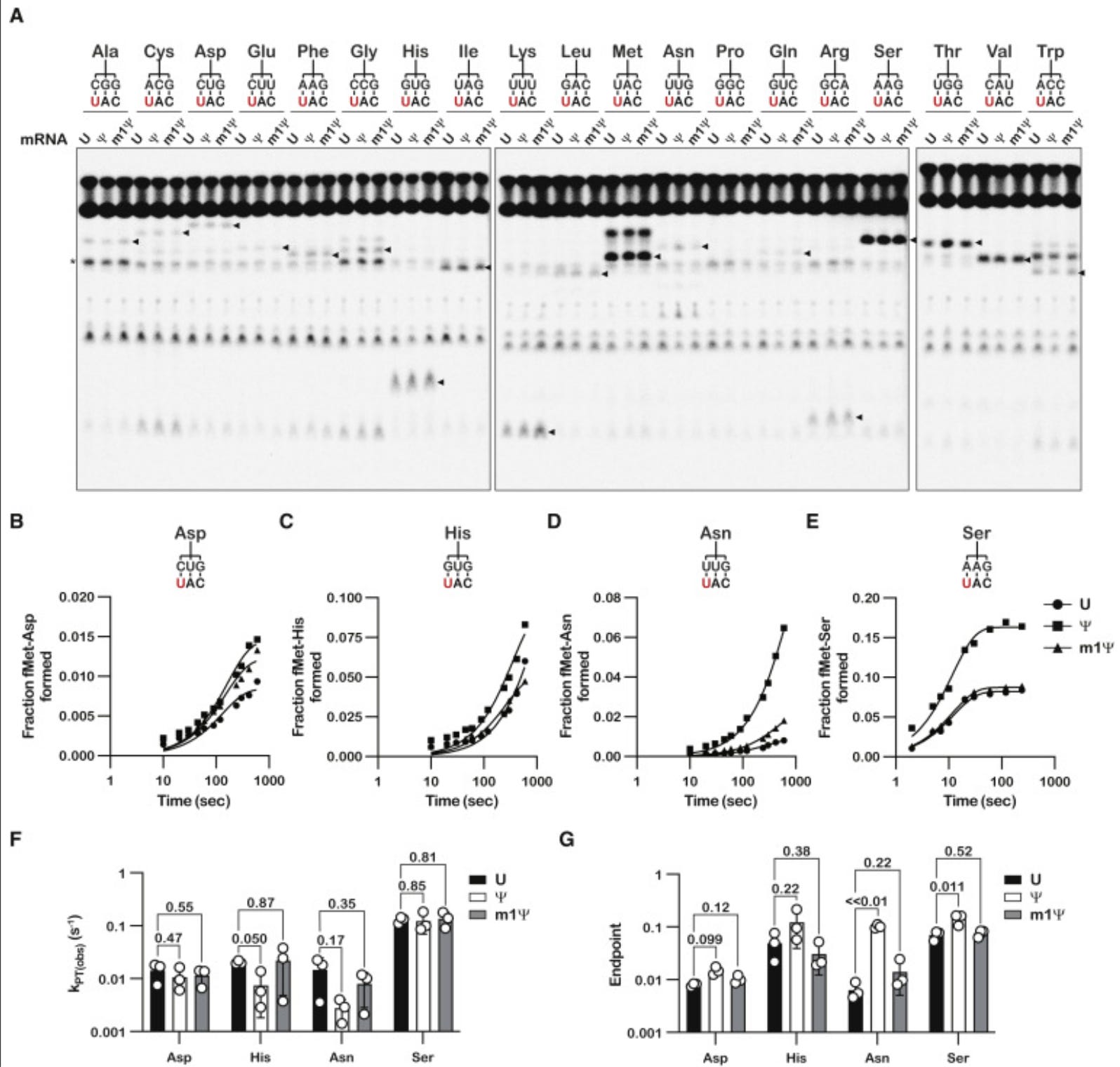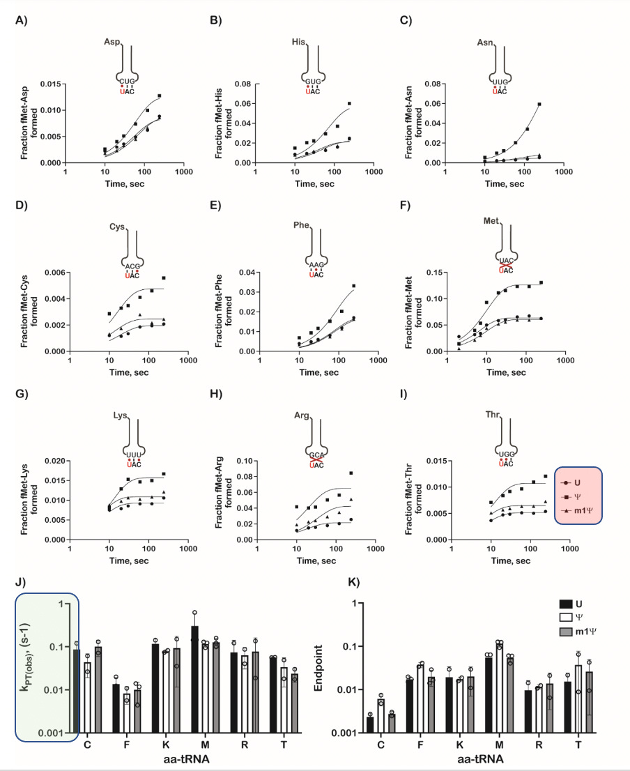 Let’s look at some of this in detail. Always be suspect of bold claims where the data supporting such claims is relegated to the supplement. They only alter the 1st base in the codon and one can clearly see different kinetics with each base (Squares, circles and triangles reflect each base- highlighted in red on the figure). When ever you want to suppress a difference visually, you can convert the Figure into a log scale on the Y axis (figure K and J- green highlight on scale) and claim there isn’t much difference between these substitutions.