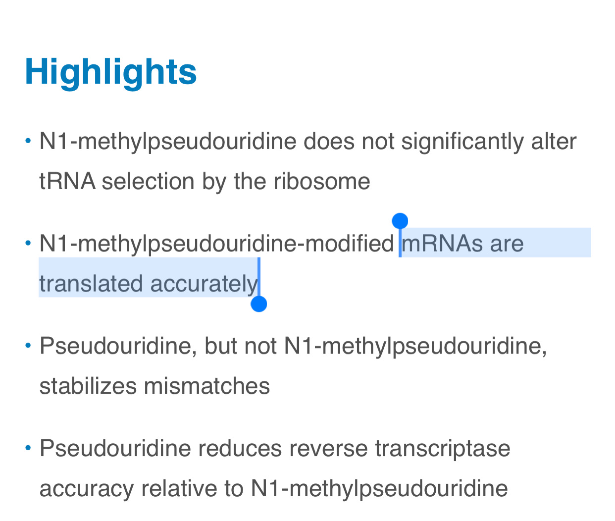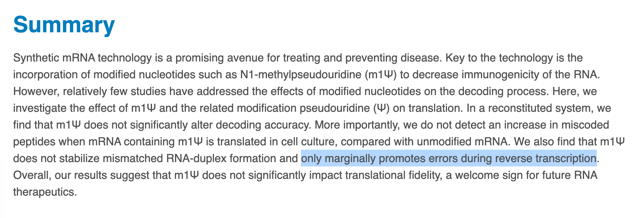 The polymerase makes errors using this base because it has a different shape than Uracil. There is an extra hydrogen bond that can form with Pseudouridine. N1'methyl pseudo U replaces this hydrogen with a methyl group that changes the bases water solubility and creates stronger base stacking compared to Uracil. This altered base stacking ultimately means the base is a ‘stickier’ base and raises the melting temperature of the double stranded nucleic acid.