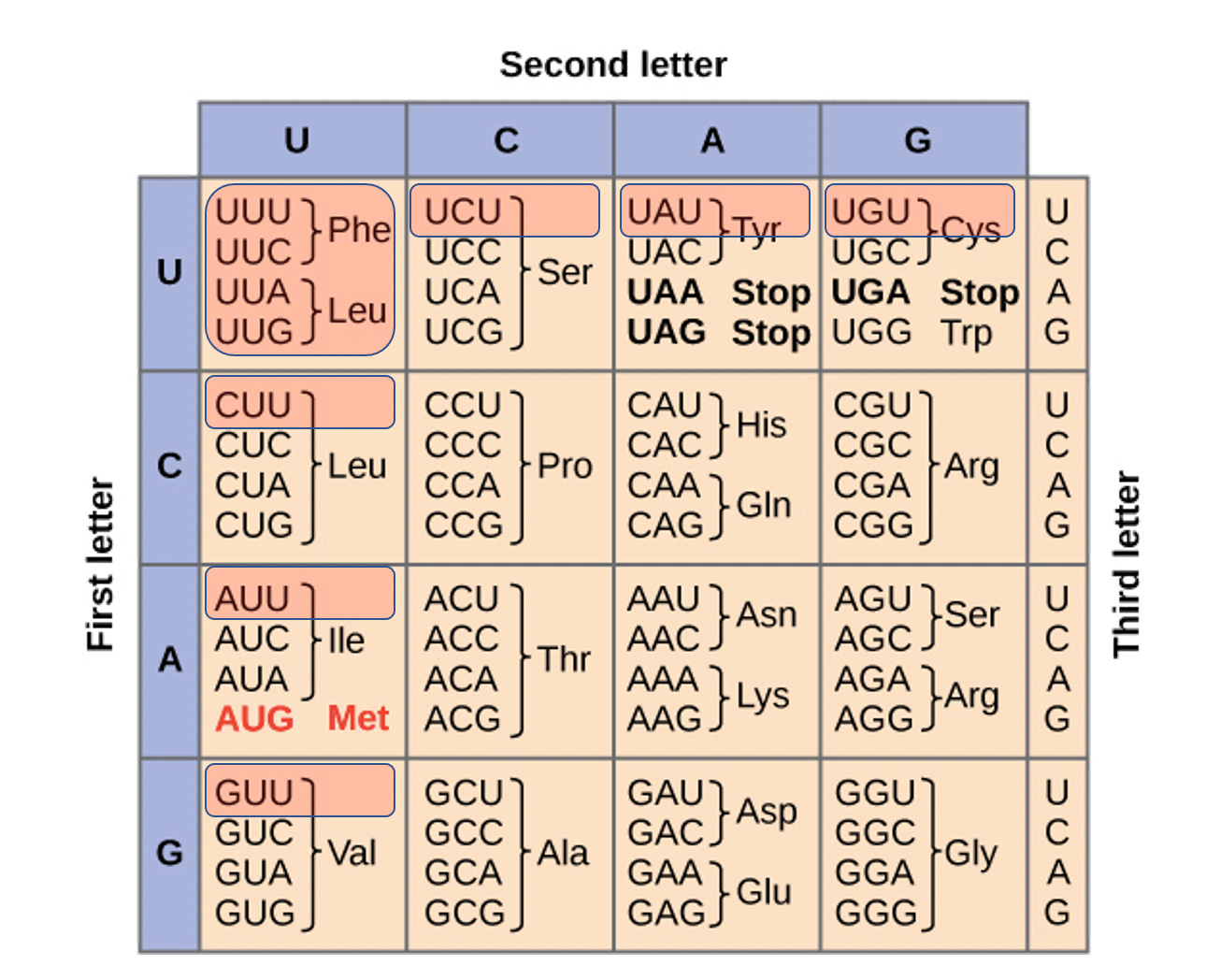 Codon Table Figure- BNT162b2 and mRNA-1273 have global Uracil replacement with N1-methylpseudouridine. The red highlighted codons contain more than one uracil replacement and are most at risk of translation error. This entails Phe, Leu, Ile, Val, Tyr, and Cys.