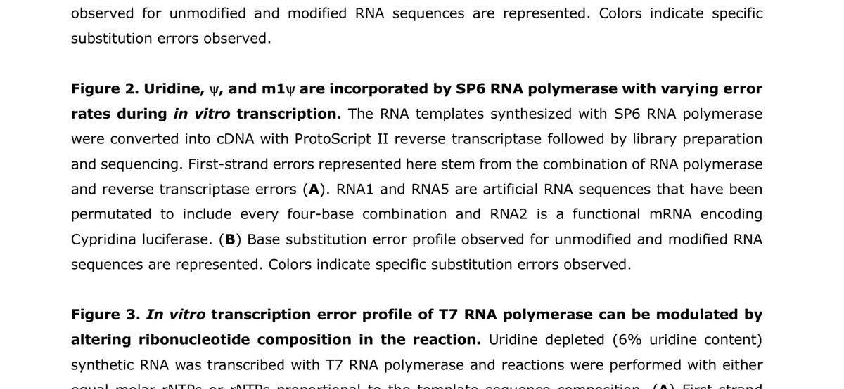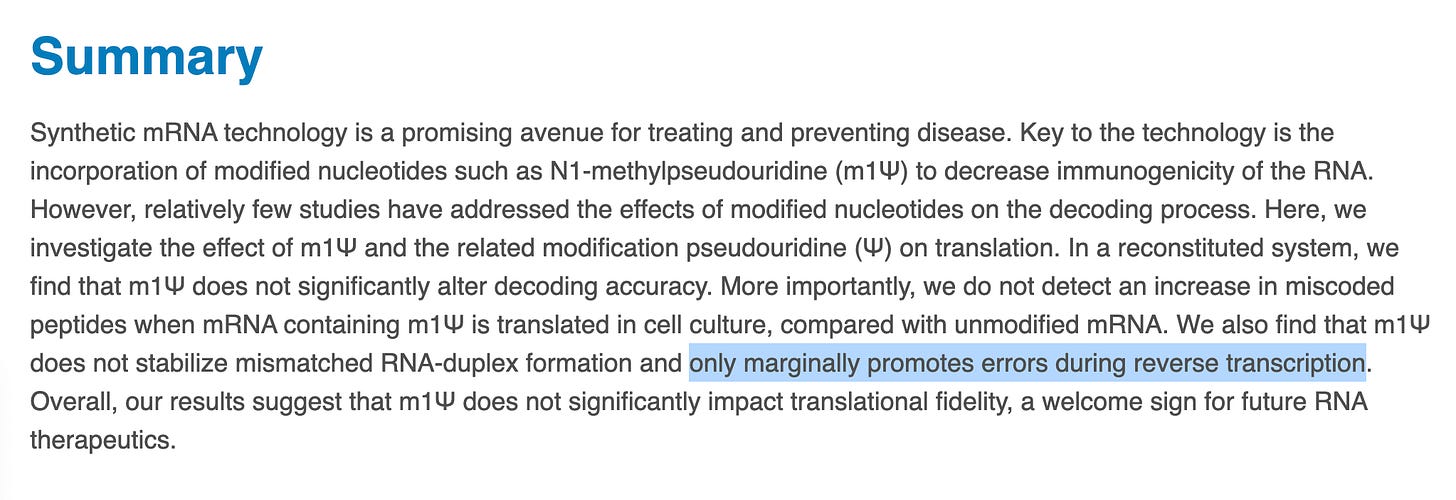 It starts with an important paper that evaluates the Transcriptional error of T7 RNA polymerase used in the mRNA generation for BNT162b2 and mRNA-1723. This paper used the most accurate single molecule DNA sequencers one can use today (PacBio). There is an even higher quality version of this chemistry known as HiFi that would improve the study but this is the best study I can find to date that accurately captures the error expected from incorporating modified nucleotides with error prone RNA polymerases. Specifically this measures the error one sees transcribing an mRNA from a DNA template like the DNA plasmids that encode the mRNA vaccines.