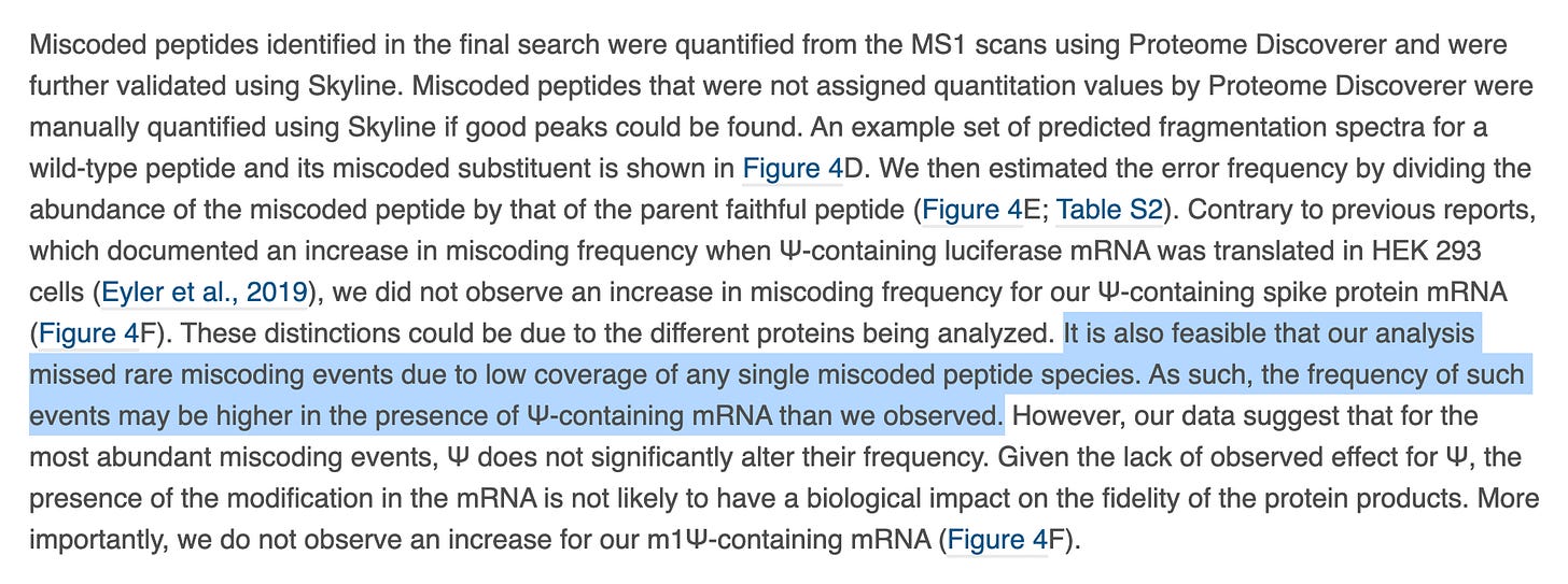 This type of language looks like subterfuge. If you don’t offer up a LOD for your assay and you have 39% coverage of the right peptides in your study, I’m going assume you have no depth of coverage to find 1% errors and you thus don’t care about them. Yet 1% translational error with trillions of expressed proteins, can amount to billions of proteins with error. Keep in mind, this sequence has a super-antigen in it so we want to avoid mutagenesis reactions on super antigens as making them worse would be a real bummer. How much should we tolerate, some ask? I think the tolerance should be near zero given they are being injected by force, without liability and now into children who don’t actually clinically benefit from them. If these were voluntary shots, knock yourself out. To each their own but let’s be transparent about what it is.