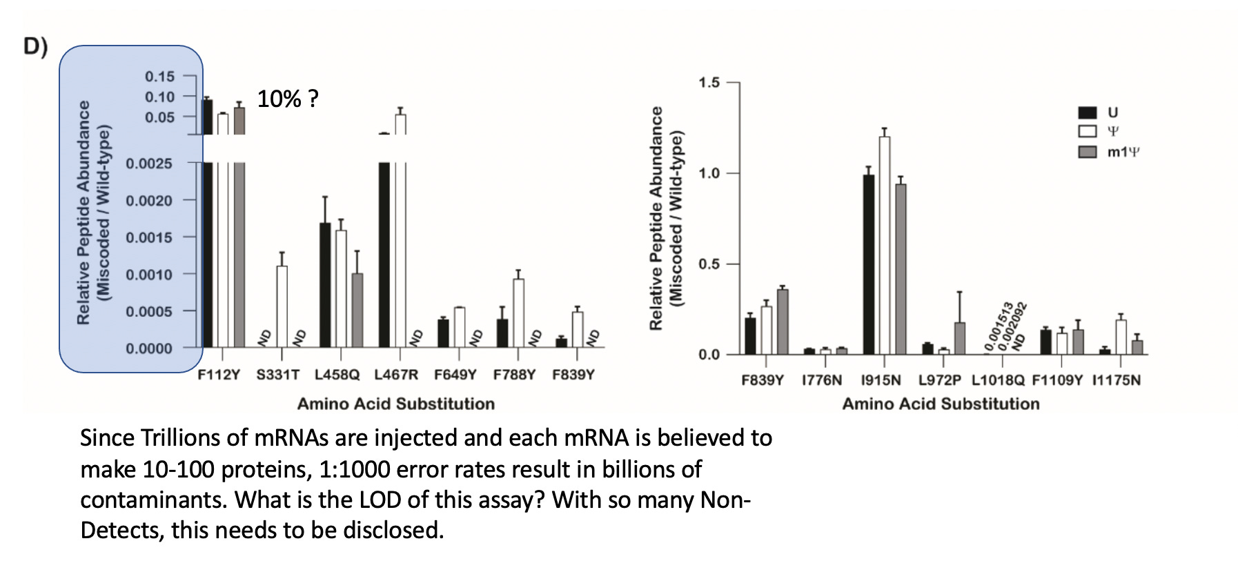 But most importantly, the claims of accuracy in the Highlights seems to rest on this Mass Spec data buried in the supplement. There are a lot of Non-detects (ND) in the chart which begs the question of what is the Limit of Detection (LOD) of this assay. The Y axis implies 10% translational error at F112Y and some differences at other locations. There are differences amongst the bases.