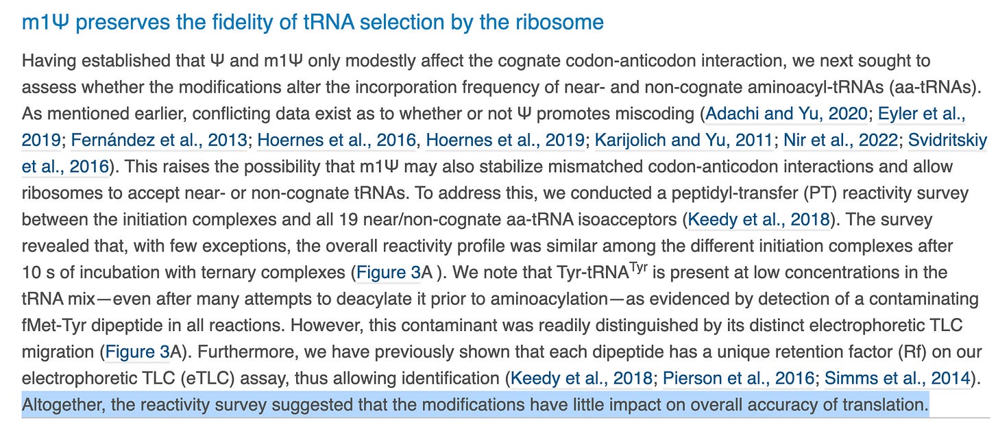 This ‘stickiness’ also confuses the ribosomes that must read this RNA and translate it into protein. This is where the transcriptional error compounds with translational error. The N1-Pseudo Us throw sand in the gear of the two main cellular fidelity systems, Transcription and Translation. They likely have influence on miRNA biology and telomere biology given the role natural RNA methylation plays with the PUS class of enzymes.