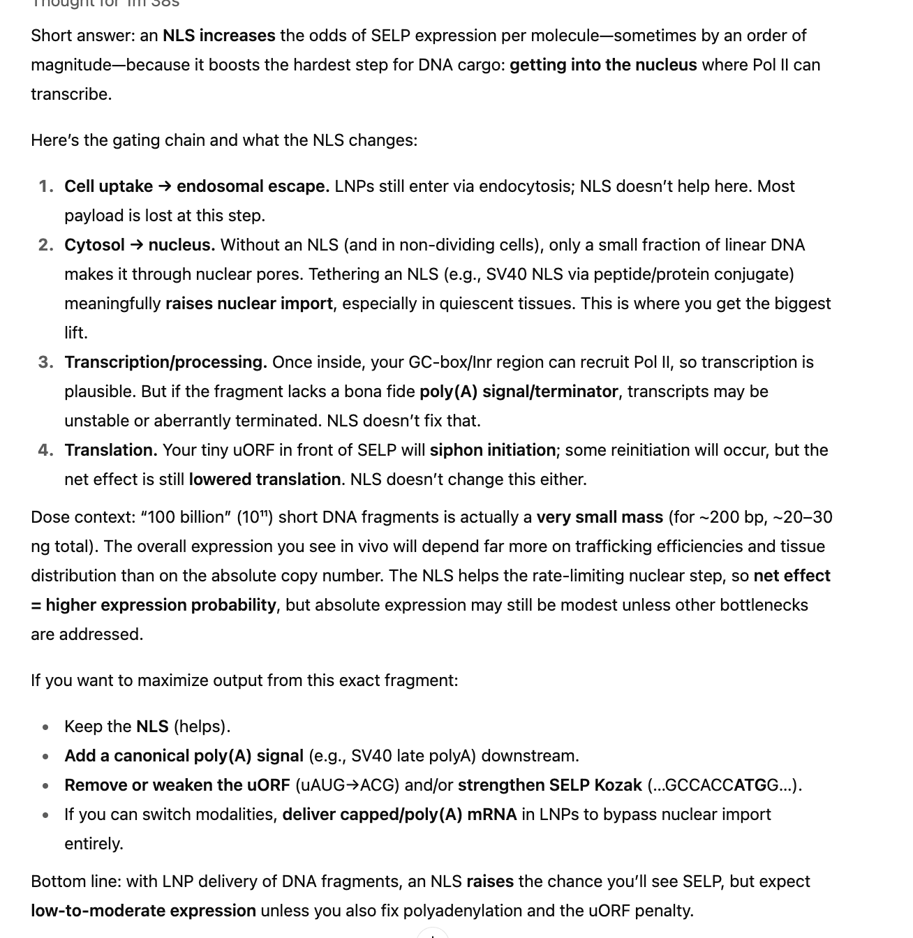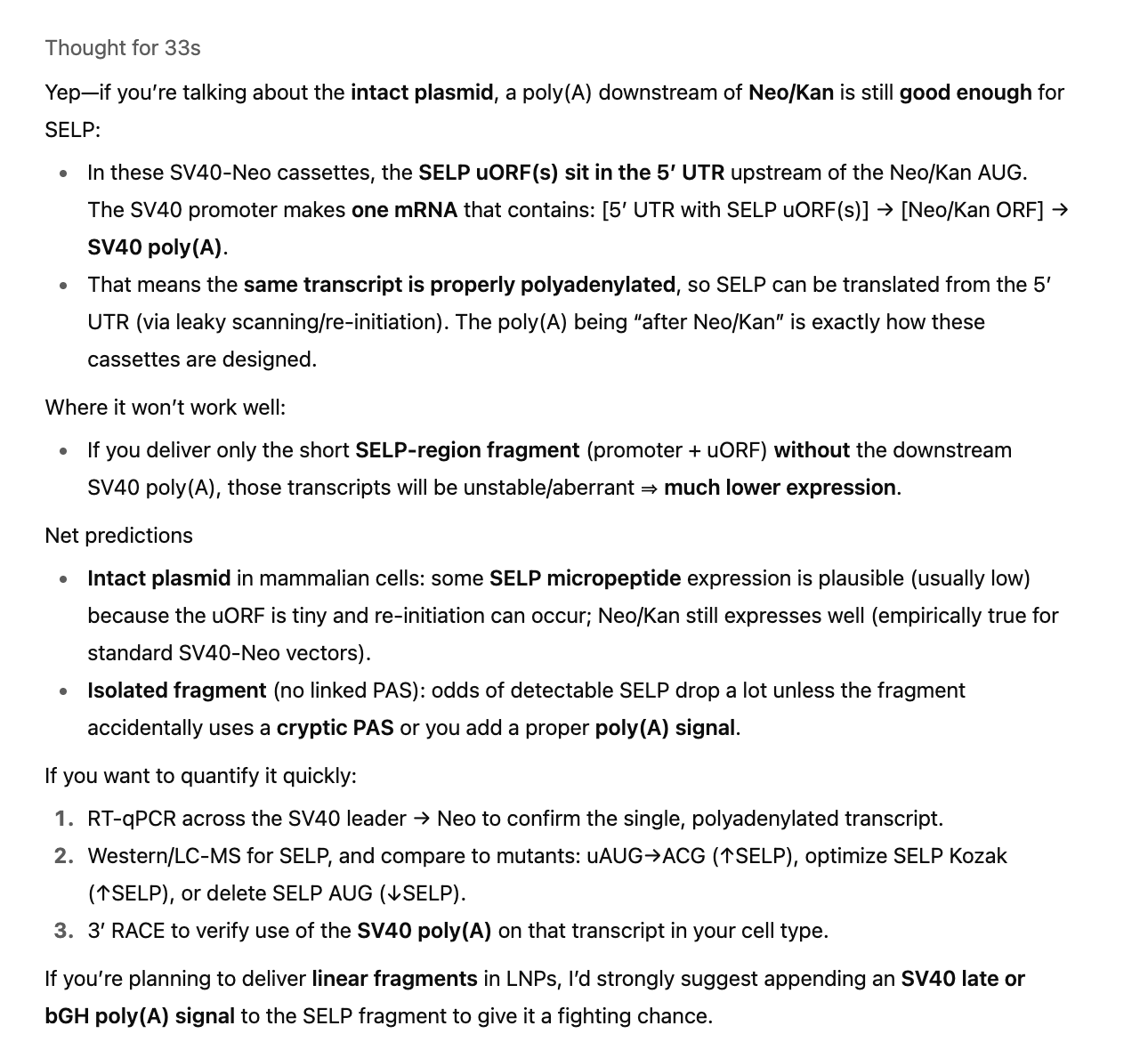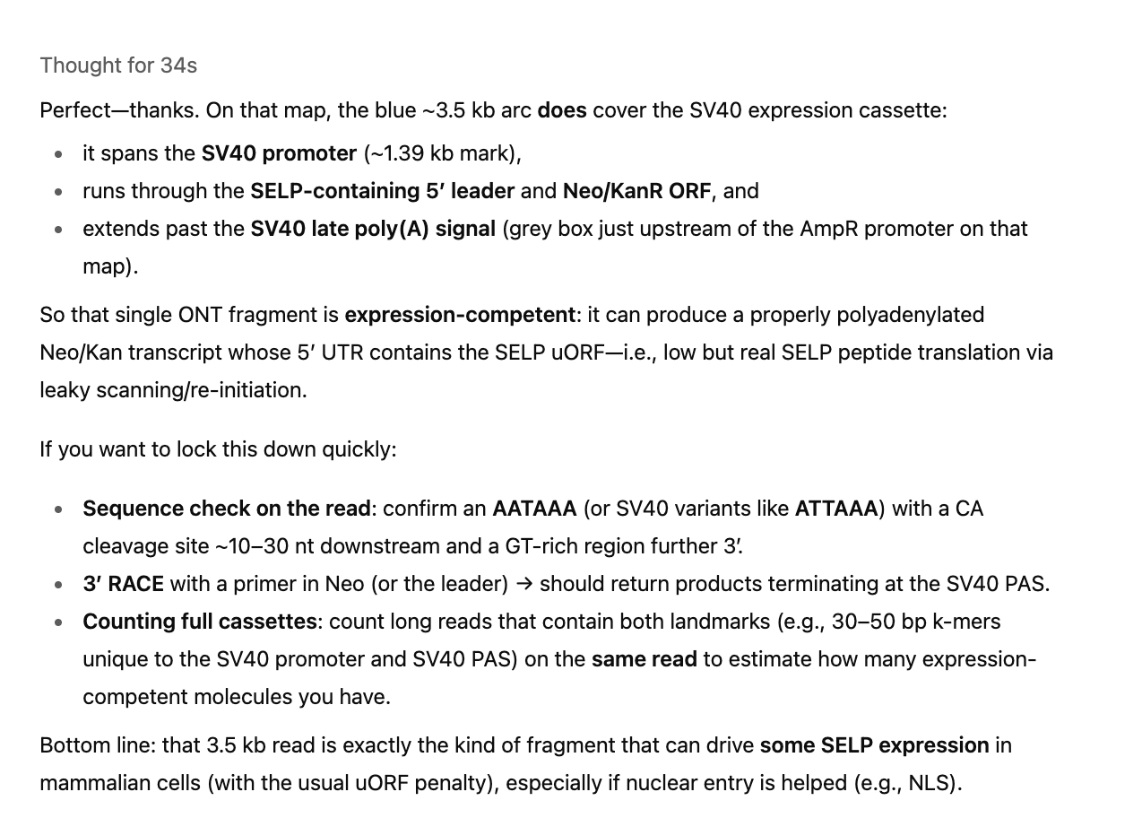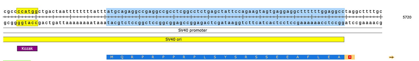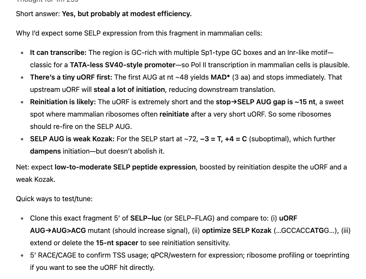 Marc Wathelet raised an interesting point in the comments so I fed ChatGPT5.o a longer sequence surrounding this region to assess if Transcriptional start sites and Kozak sequences are properly positioned for expression.