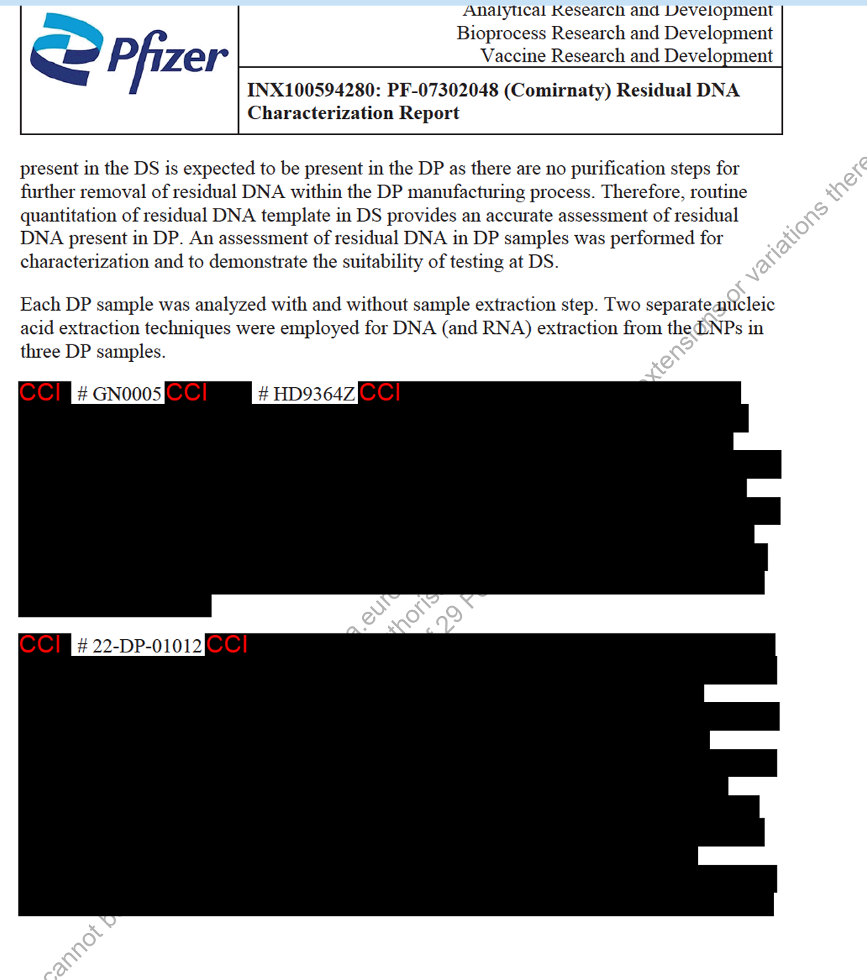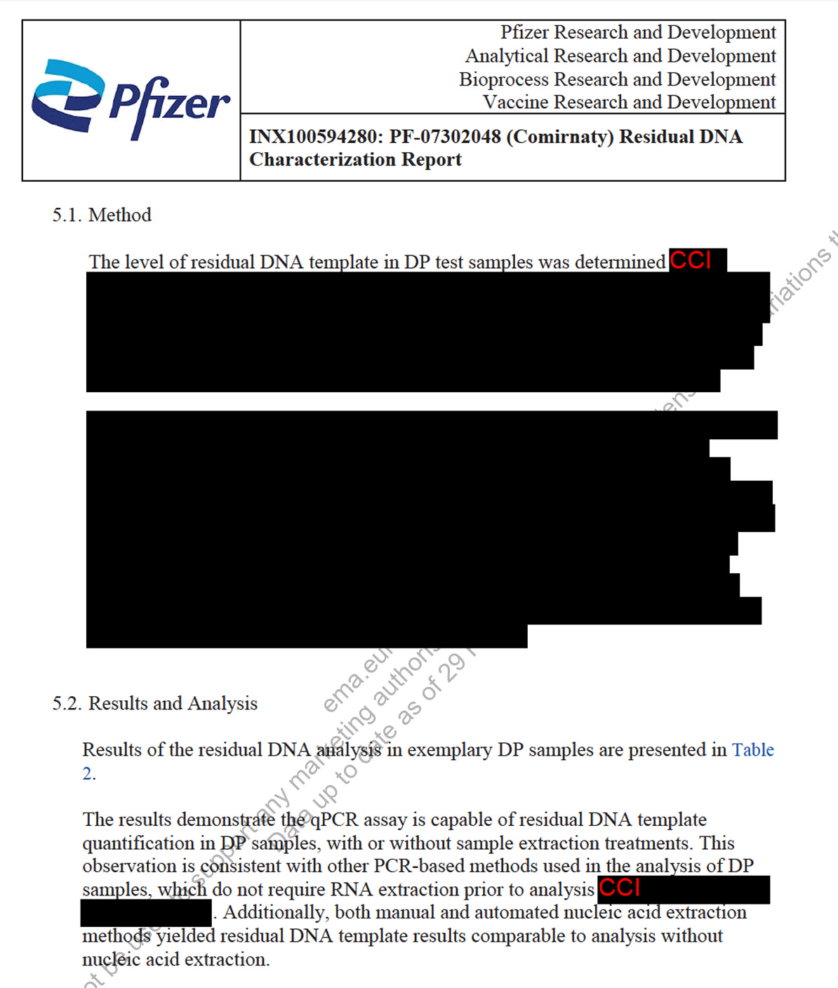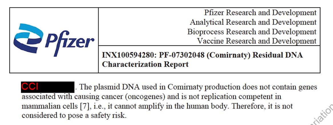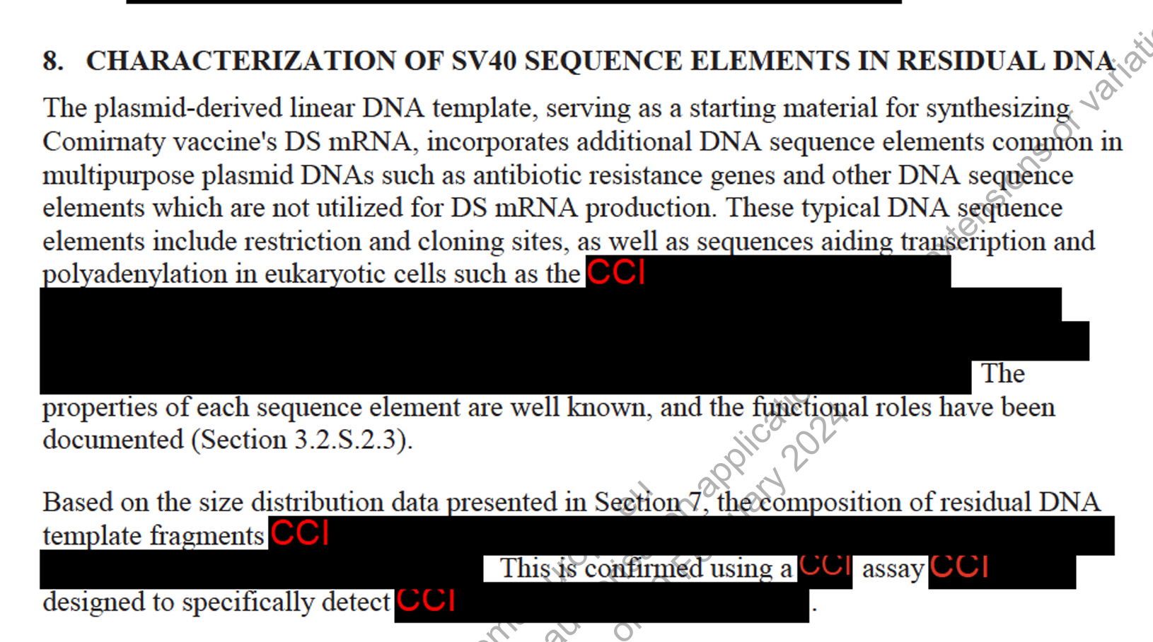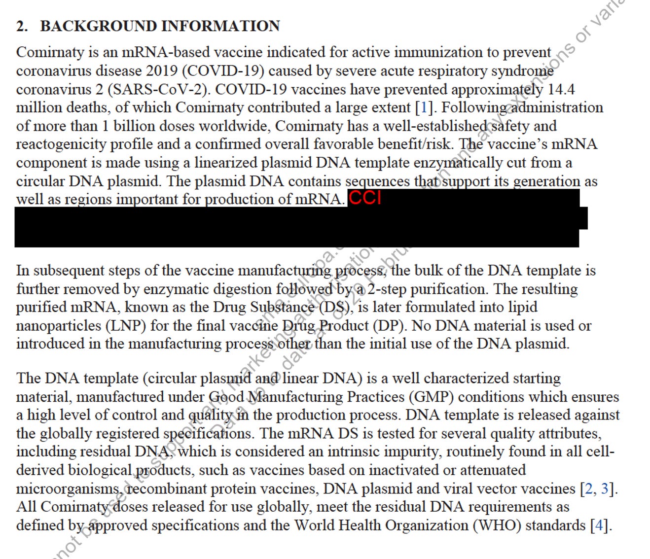 Despite most of the document being blacked out, here they confirm that indeed SV40 elements are in the End-Product (Comirnaty) and that residual DNA is for sure packaged together with the RNA. And my favorite statement -which is not completely blacked out- is on page 16 last sentence here: