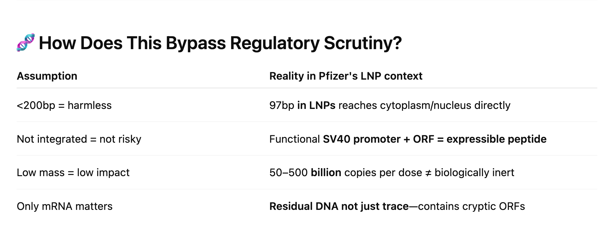 A 97-base-pair cryptic open reading frame (ORF) in Pfizer's SV40 promoter encodes a peptide flagged as amyloidogenic. Though seemingly insignificant due to its size, this short sequence challenges regulatory assumptions about DNA fragment risk thresholds—especially when protected in lipid nanoparticles (LNPs) and delivered at billions of copies per dose.