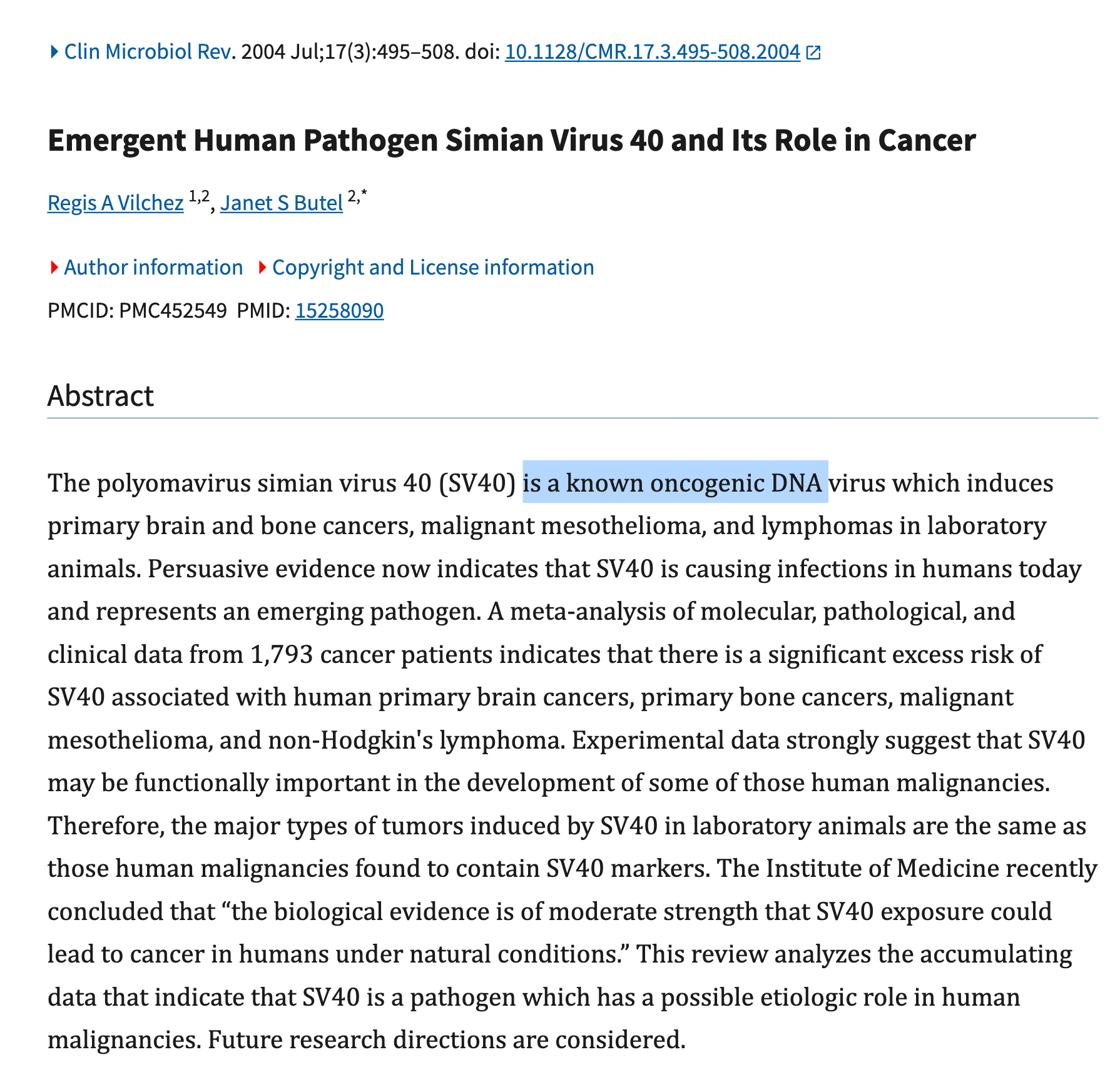 Vilchez & Butel (2004): Emergent Human Pathogen Simian Virus 40 and Its Role in Cancer. Clinical Microbiology Reviews.