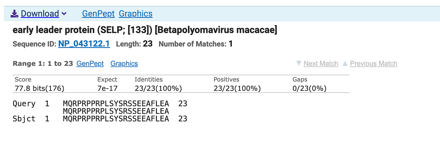 This peptide has an NCBI hit to its SV40 relative and is an annotated peptide. Evidence of its viral expression in monkeys exists.