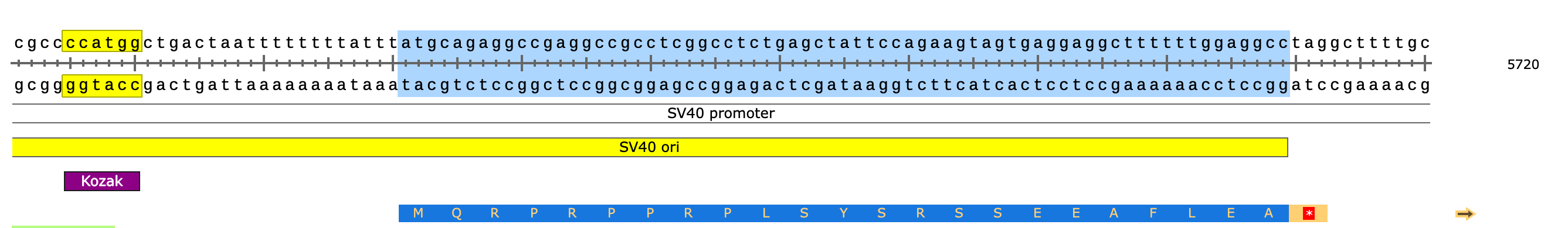 Within the SV40 promoter upstream of the Neo/KanR gene, a Kozak consensus sequence (ccatgg) and downstream ATG codon were identified. This marks the start of an open reading frame encoding the 23-amino-acid peptide: