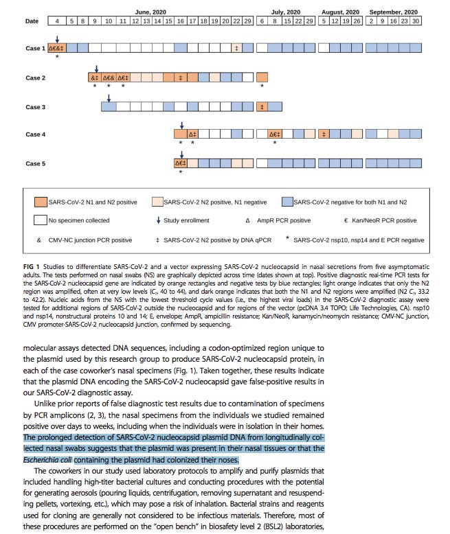 This was a small lab. Imagine a lab that needs to brew enough plasmid to make billions of doses seen with the Pfizer and Moderna manufacturing processes. In this case the colonized lab staff may infect their roommates with spike encoded plasmids. This would trigger RT-qPCR tests looking for spike. In these cases the patients would be positive for spike but negative for Nucleocapsid RT-qPCR. It is unclear if spike antigen tests would be positive as the study didn’t address that question. Its unlikely bacteria will translate mammalian mRNAs with Kozak consensus sequences but if those bacteria are engulfed into mammalian cells through bactofection, it is possible.
