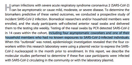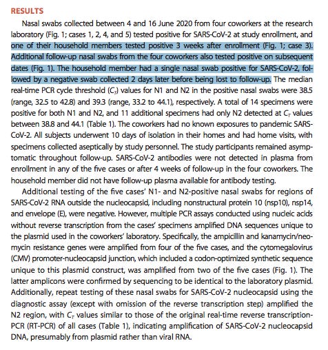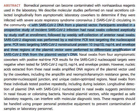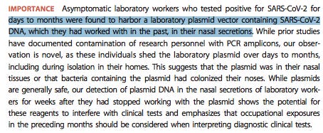 An interesting paper bubbled up while I was searching for DNase I inhibitors. This documents a case of BSL2 lab staff triggering false positives for Nucleocapsid C19 RT-qPCR tests. Normally this would go unnoticed and be chalked up to one series of asymptomatic cases of C19 but these folks dug deeper. It appears the same lab was working with plasmids that encode the nucleocapsid gene of SARs-CoV-2 and this plasmid colonized the airways of a few lab staff.