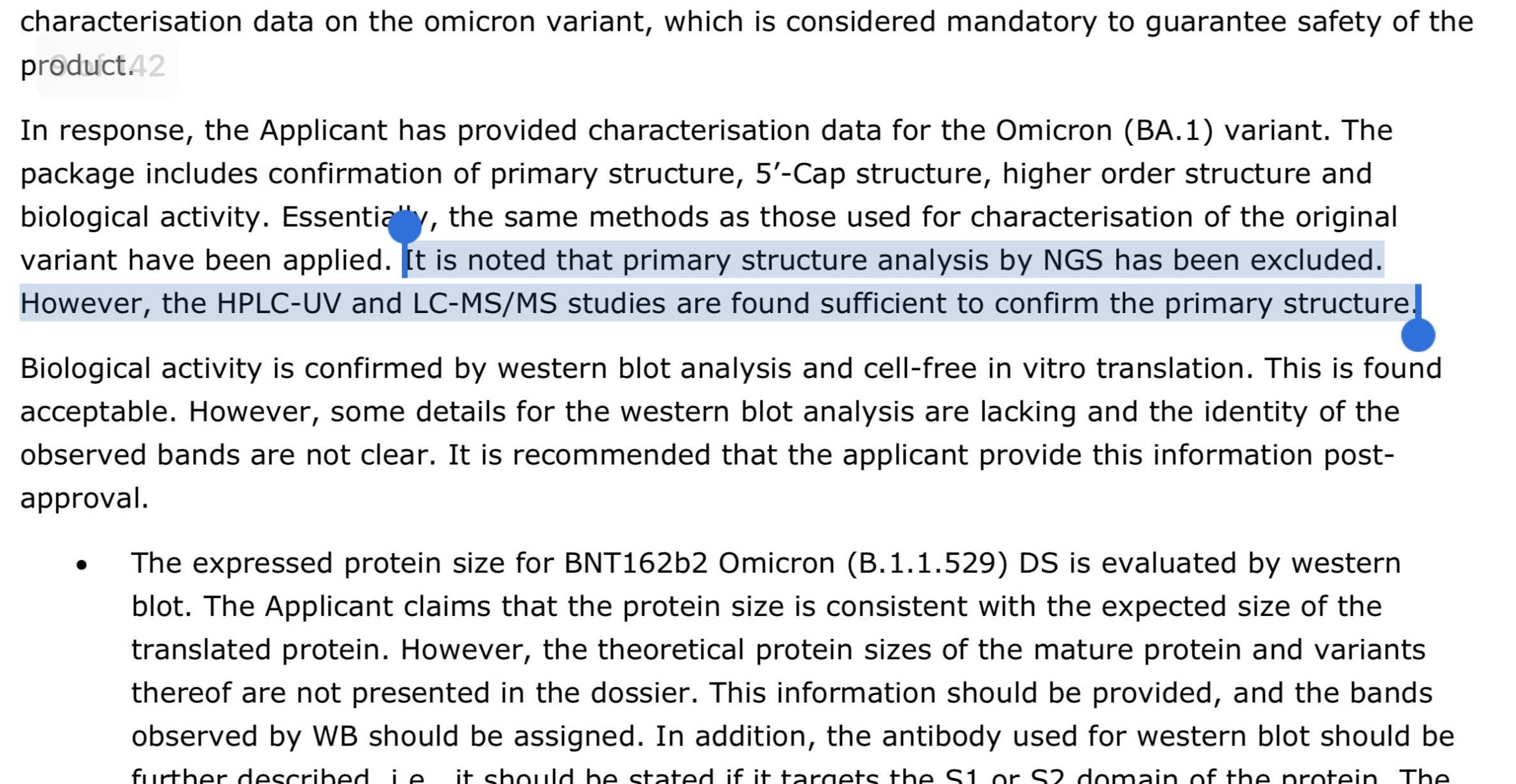 EMA documents from August 2022 exist for the Pfizer Bivalent vaccine. These documents state that NGS (Next Generation Sequencing) data exists but were not supplied to the EMA. The EMA also made note of there being only Western Blots available for characterization of the translated product and that the bands did not match the anticipated sizes.