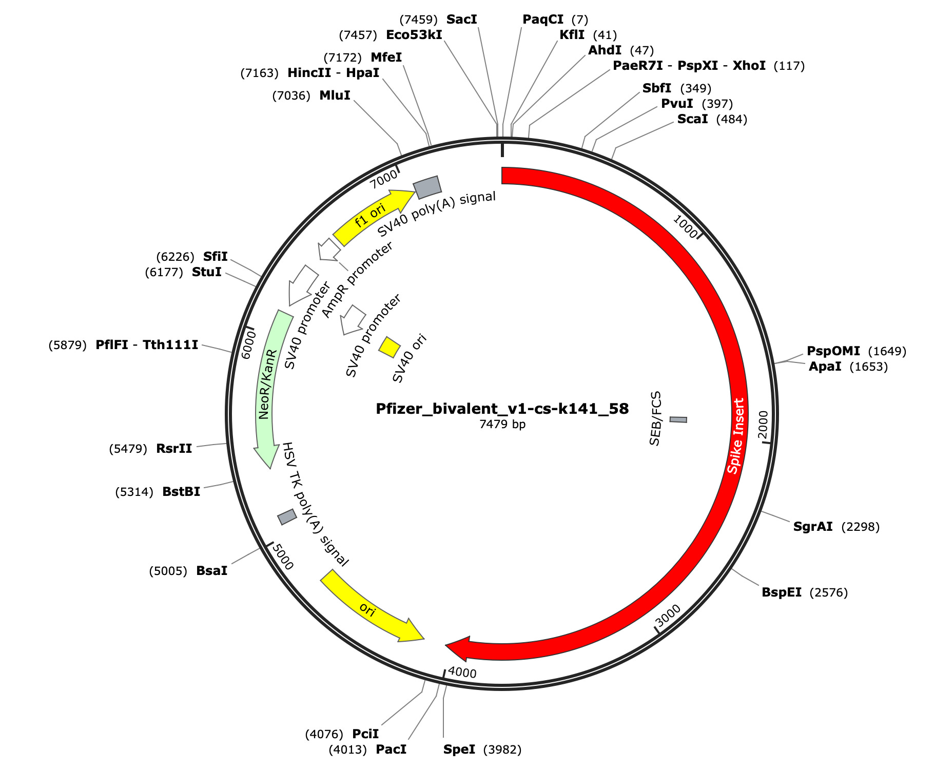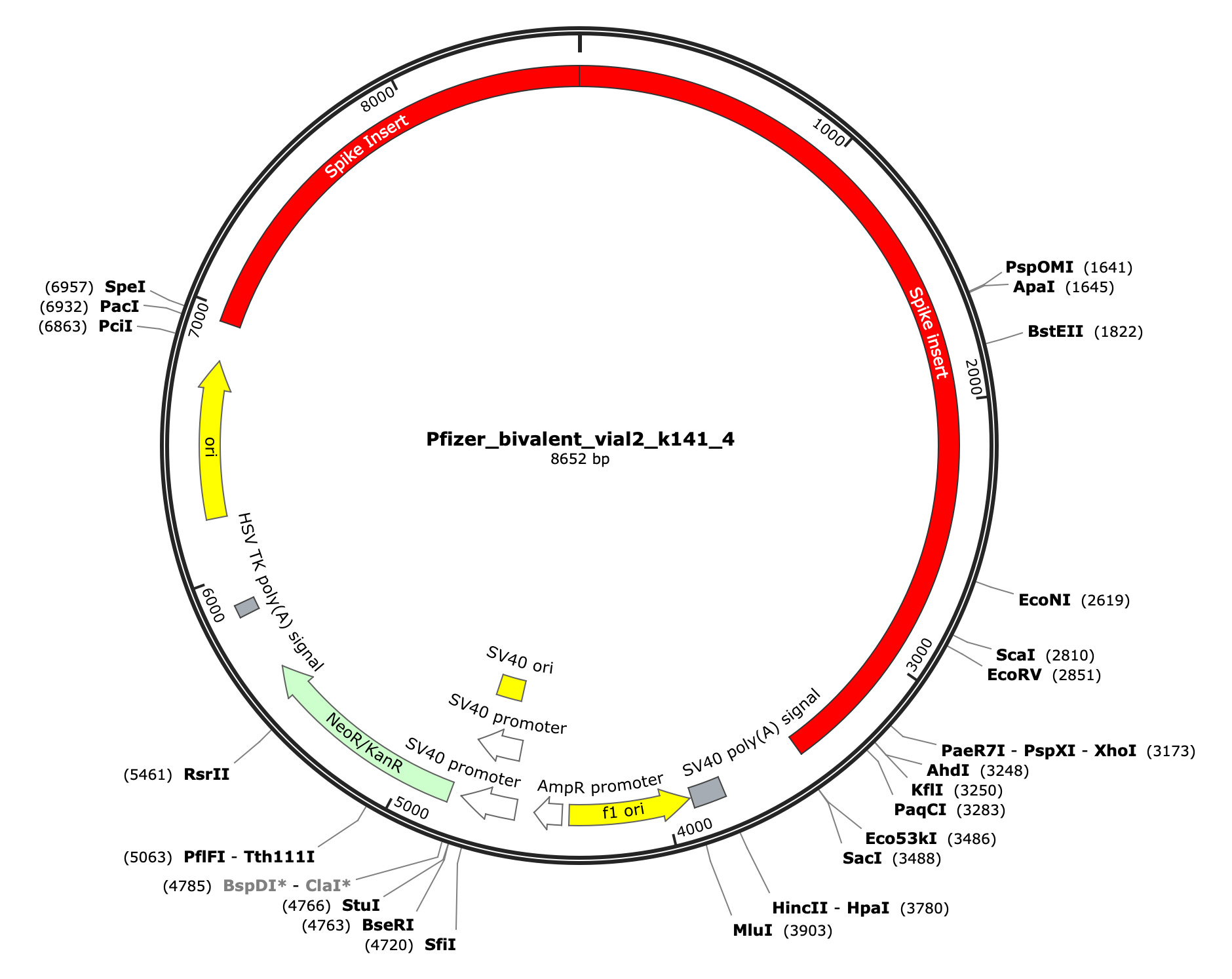 The EMA set limits for dsDNA contamination at less than 330ng/mg RNA. This is roughly 1 part per 3,030 mRNA molecules. It is not clear how they set these standards. For instance, a shot containing 34 trillion mRNAs with a 1 part per 3,000 plasmid contamination rate would equate to over 10 billion antibiotic resistant plasmids being transfected per patient. The sequencing evidence we now have on hand confirms that most of this DNA is in-fact the expression plasmid DNA, complete with spike protein, SV40 mammalian expression promoters, aminoglycoside antibiotic resistance and high copy origins of replication that are compatible with both mammalian expression and bacterial amplification.