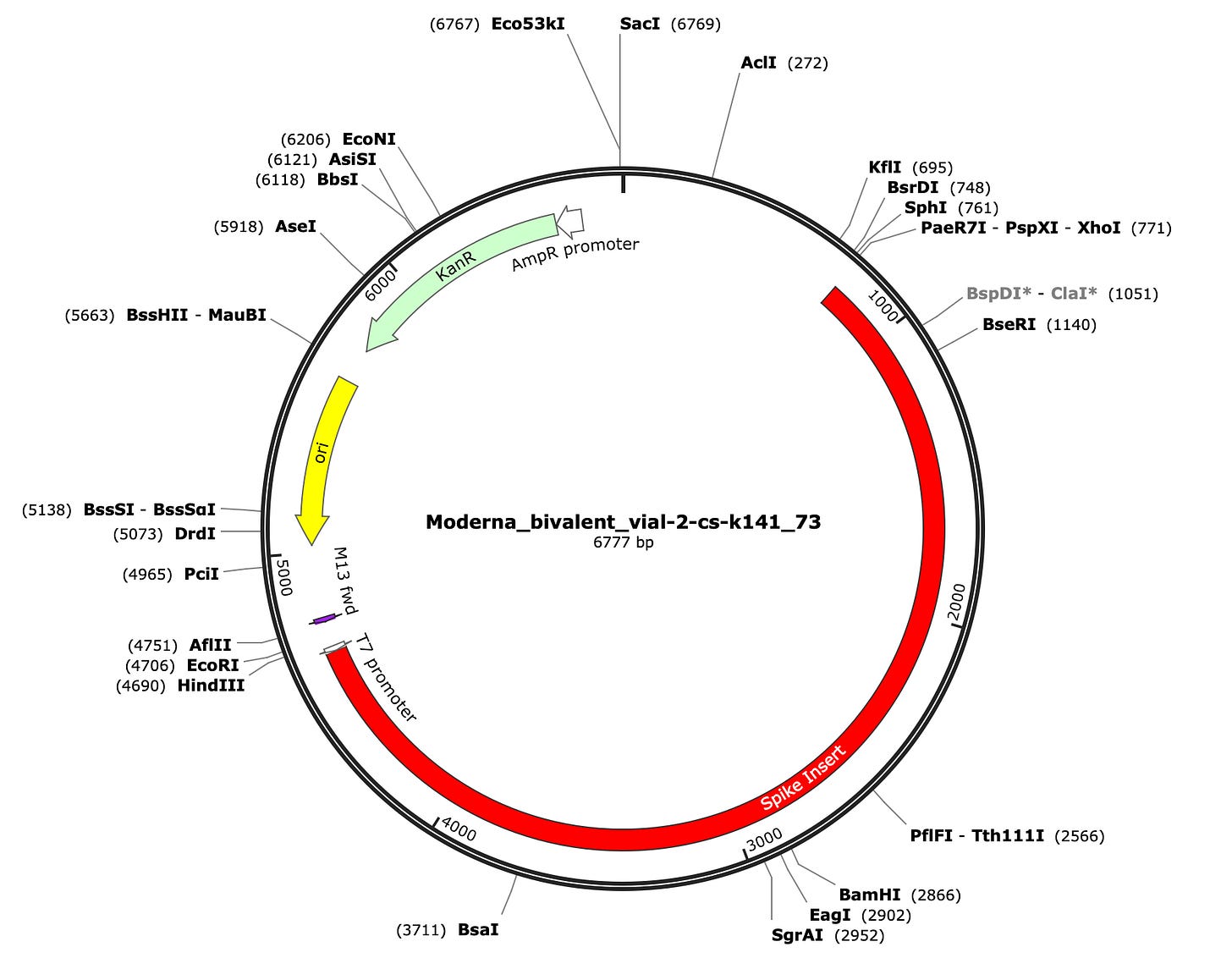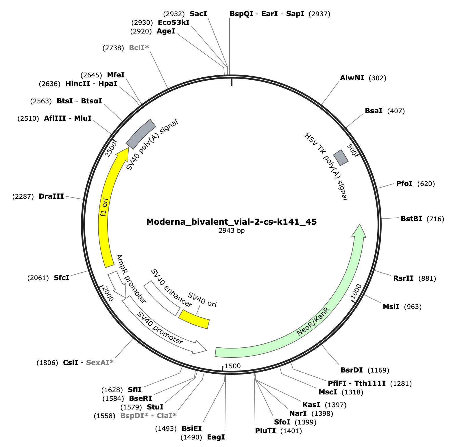 Deep sequencing of the Moderna and Pfizer bivalent vaccines identifies contamination of expression vectors designed for plasmid amplification in bacteria.