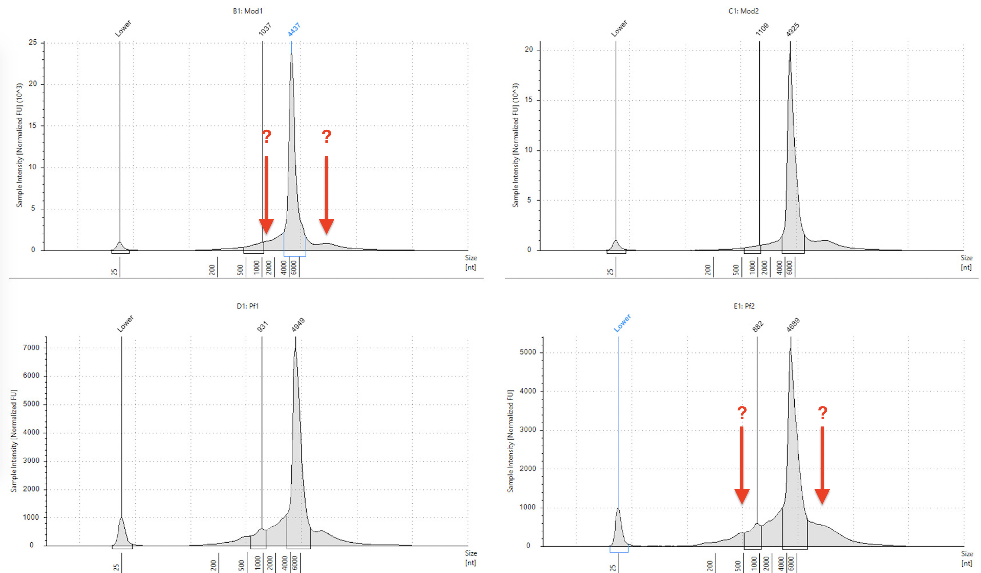 Fragment analysis of each vial is depicted in Figure 1. RNA fragmentation is evident in both brands and all lots but is particularly notable in Pfizer vials. Surprisingly, mRNA products longer than the anticipated length of the mRNA were also observed in the bivalent vaccines.
