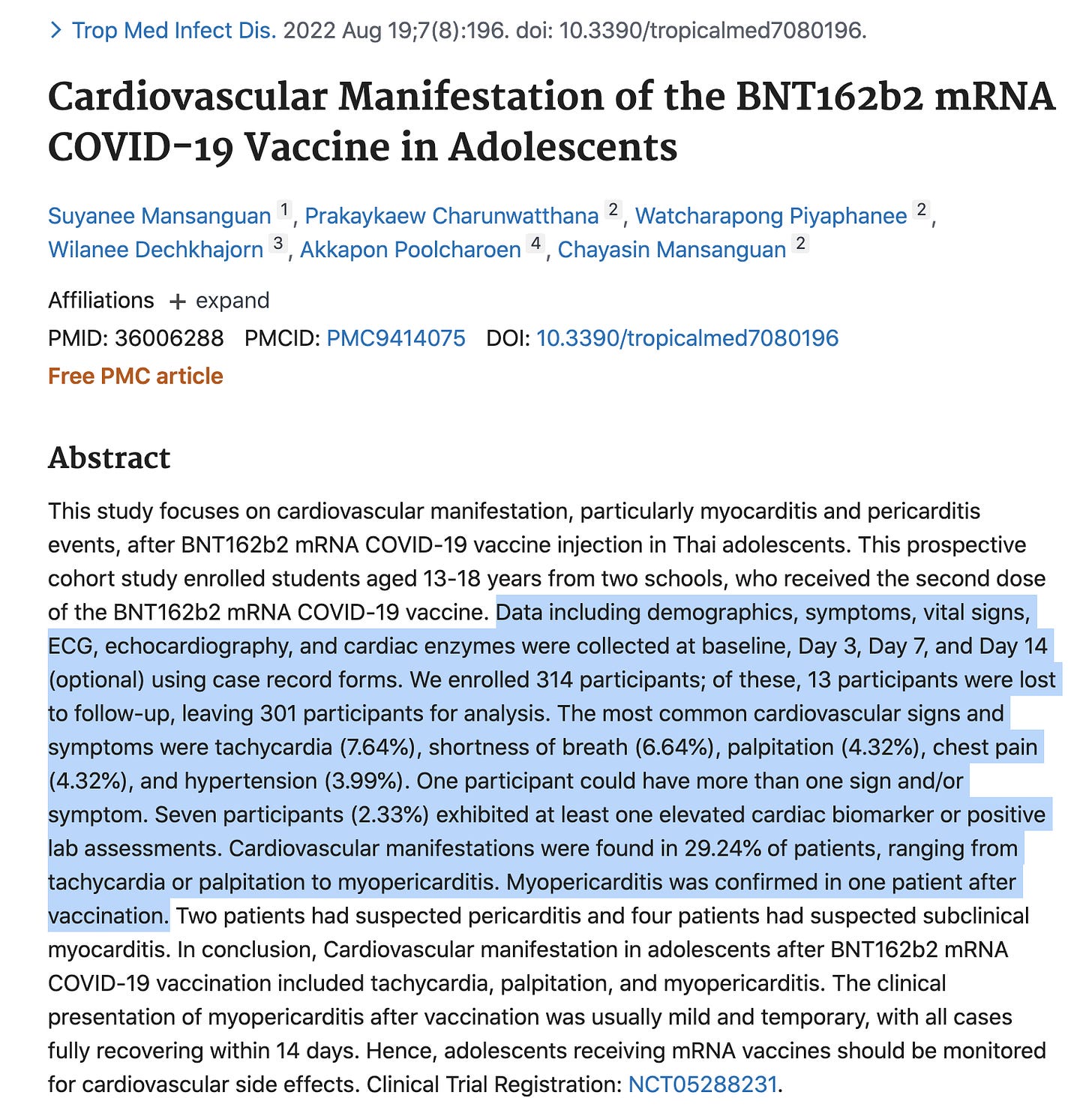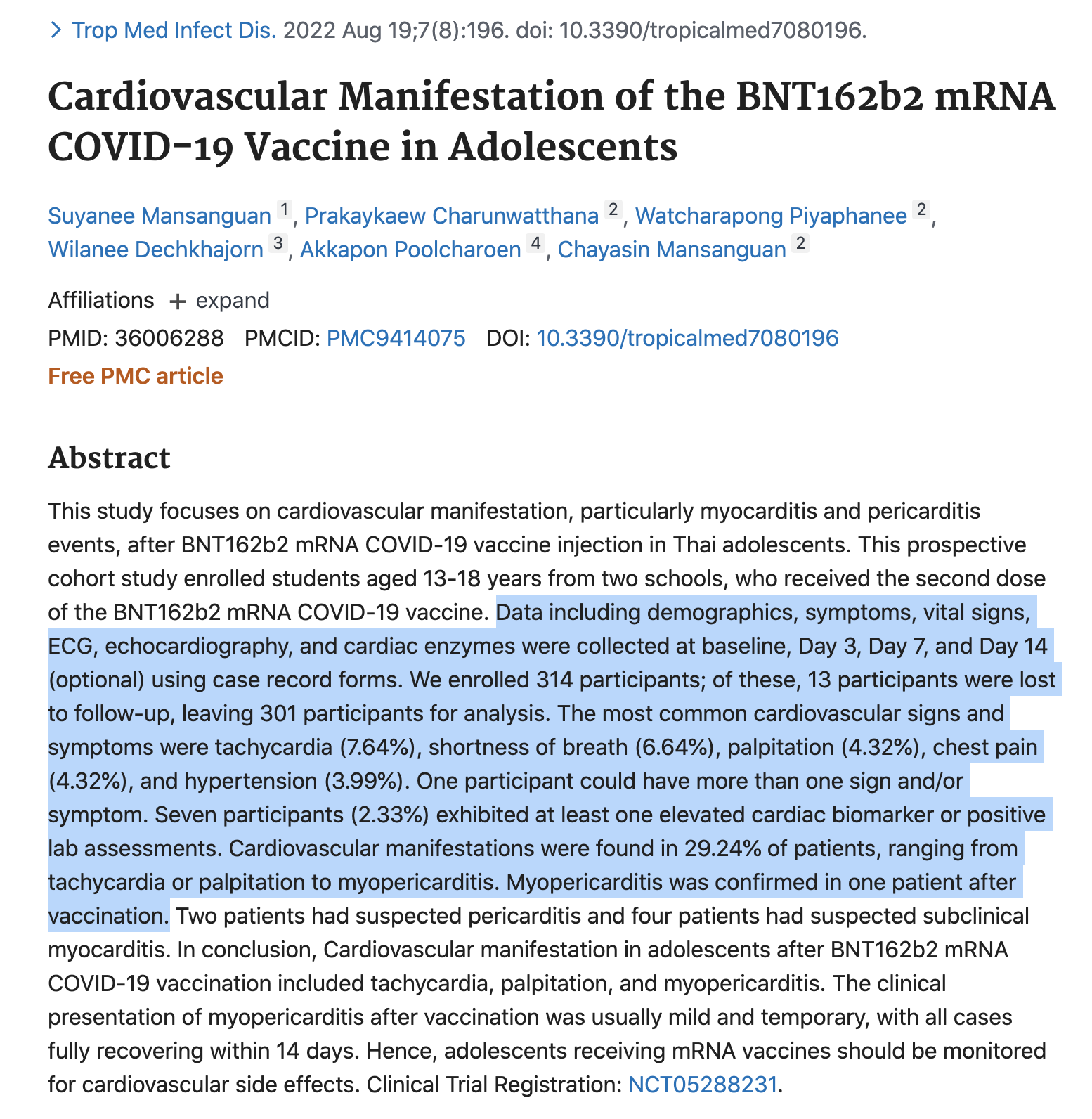 The “Thailand study” (Mansanguan et al) implies even higher rates of cardiac risk for students, where 29.24% of students (n=301) experienced cardiovascular manifestations. Studies including 23 Million Nordic patients observed a significant rate of myocarditis in this age group as well. This study, while larger, was not as controlled as the Thailand study in that Mansanguan et al. took baseline measurements of the patients and explored more than just myo/pericarditis.