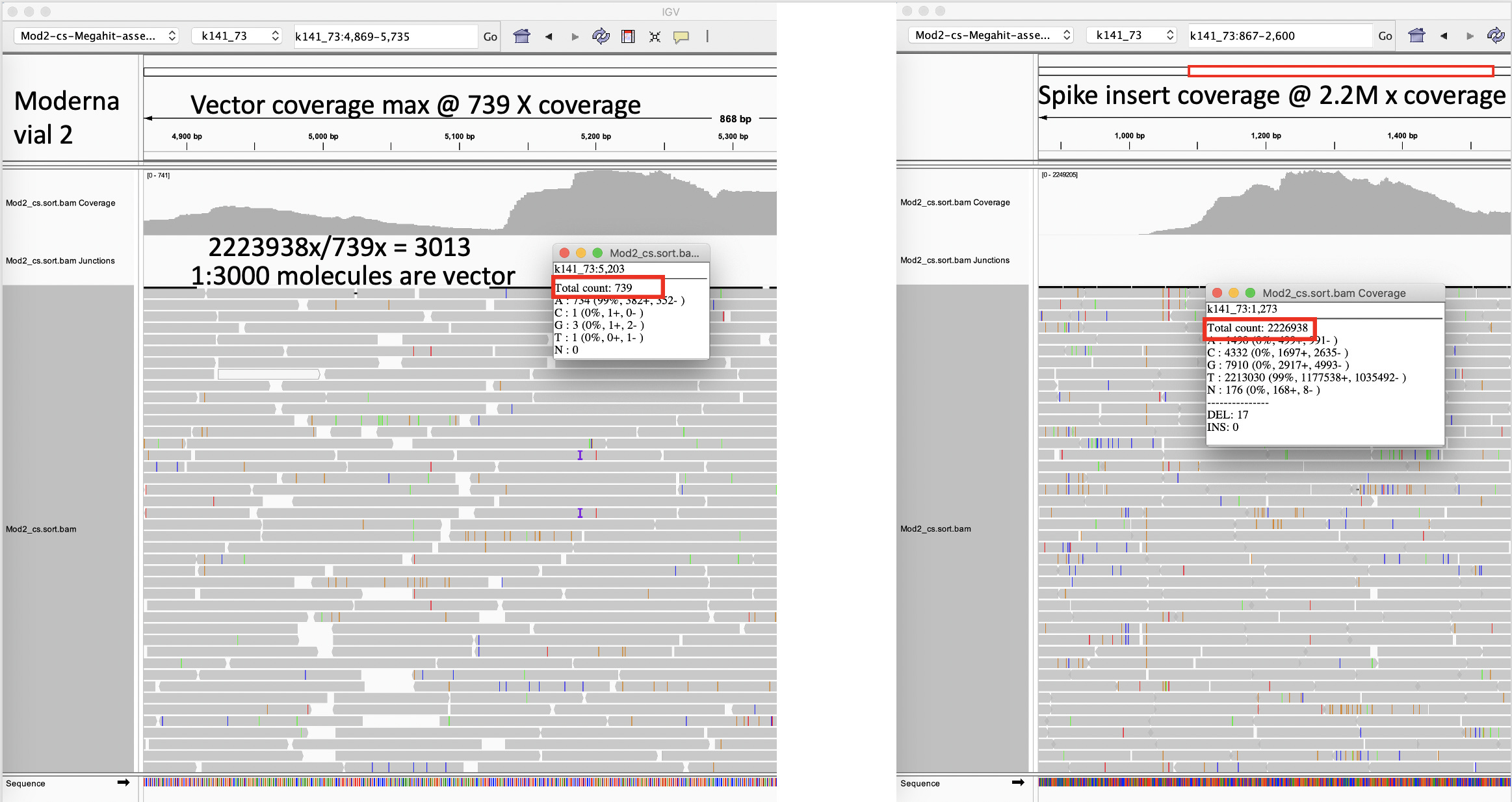One can make a quick estimate of the relative ratio of the vector to insert nucleic acids by looking at the maximum depth of coverage of the insert versus the vector. Moderna vial 2 has 739X maximum coverage over the vector and 2.2 million X coverage over the insert. This equates to 1 vector for every 3,000 mRNAs.