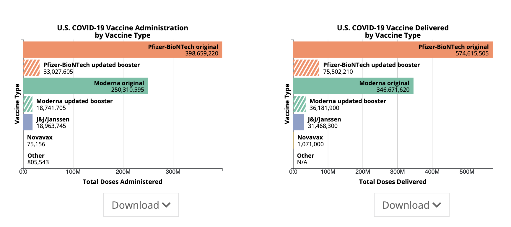 Images and lot numbers of vaccine vials. Pfizer vials are from the same lot. Moderna lots are different.