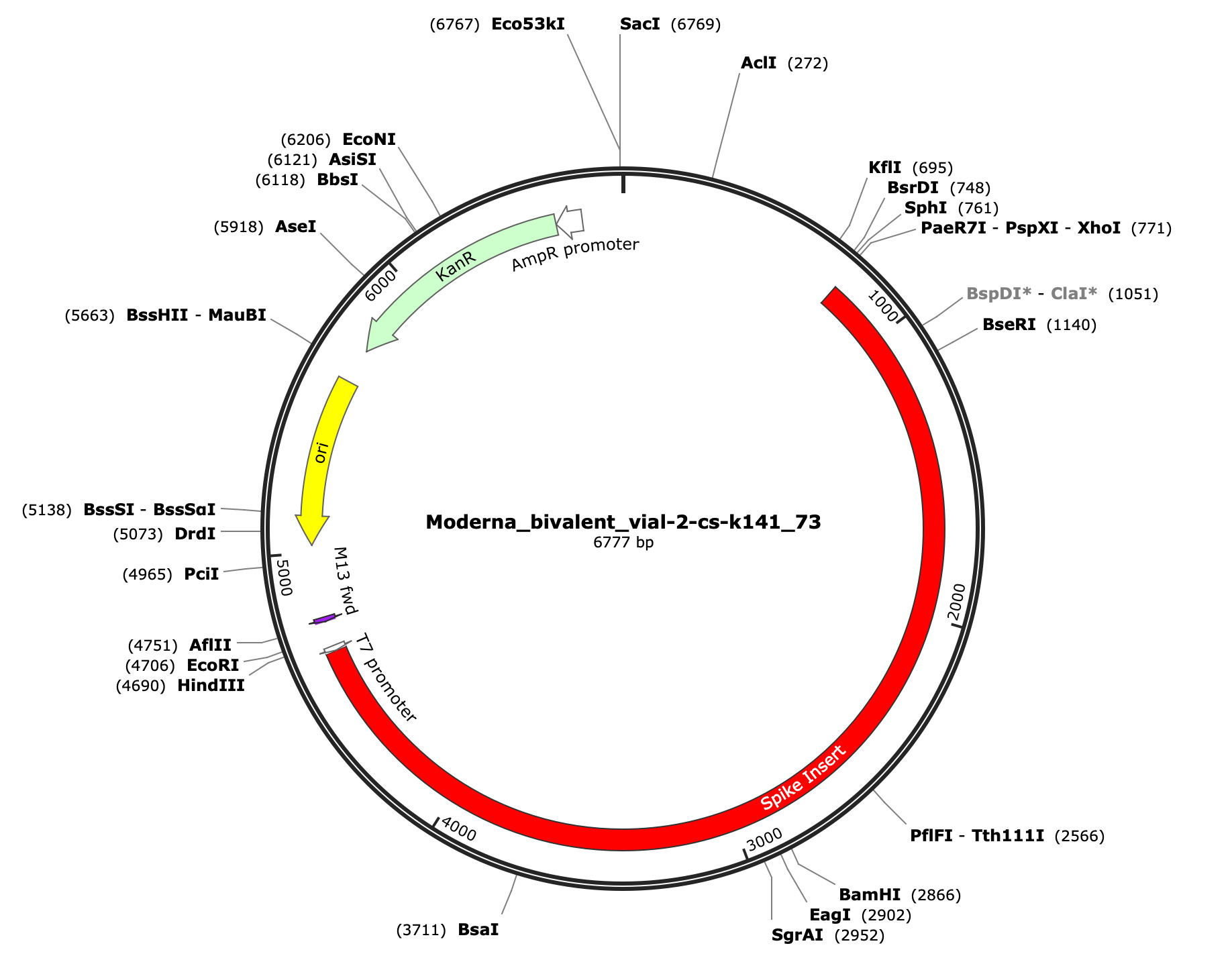 Two different expression vectors are found in the Moderna bivalent vaccines. Two different lots were sequenced and there may different background expression plasmids in each lot. Note, since these vaccines have bivalent inserts, the assembler is often splitting the inserts into separate contigs (omicron vs wuhan-1). I’ve included the entire output file from megahit to afford further polishing of these references by the public. These draft assemblies have been left in raw form delivered directly from megahit to afford reproduction of the work.