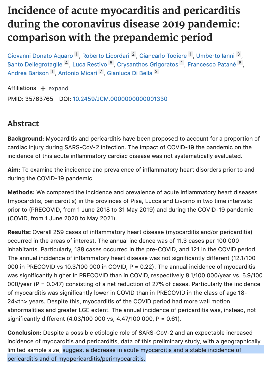 Similar results are seen in Aquaro et al. and Sechi et al. where C19 derived Myocarditis is no different than background rates.