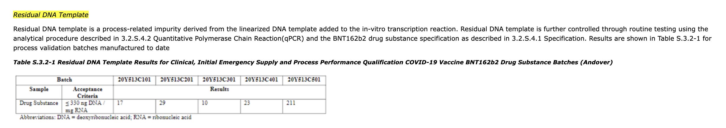 Contamination of double stranded DNA (dsDNA) in these vaccines is a significant concern. The EMA specified dsDNA limits in this vaccines below 0.33% (330pg/mg). This is roughly 1 DNA molecule for 3,000 mRNA molecules. While the Moderna vaccines are meeting this specification, the Pfizer vaccines are 10 fold higher in contamination with 1 DNA molecule per 350 mRNAs. This is 1 replication competent plasmid per 350 mRNA molecules and equates to billions of antibiotic resistant plasmids injected per person per shot.