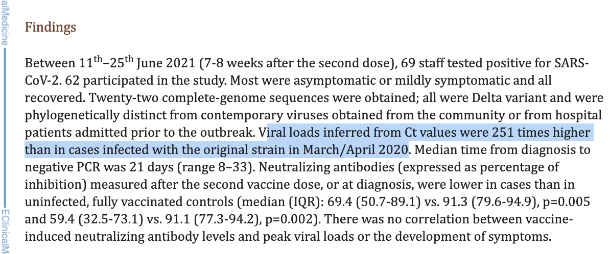 This narrow-epitope vaccine strategy, now has documented escape mutants where the majority of the mutations from Delta to Omicron are amino acid changing variants in the spike domain targeted by the vaccine program. This enrichment in amino acid changing variants over synonymous variants is the hall mark of selection. Vaccines that don’t stop transmission and fail to limit the viral load of the patient, leave the evolutionary clock of the virus (RdRp polymerase) intact but merely steer evolution around the paddle you placed in the river. Chau et al. demonstrated higher viral loads in the vaccinated. The study traversed multiple variants but other studies suggest equal to slightly lower viral loads in the vaccinated. Even in these cases the variance is a few CTs and in the 10^8 range. Dahdouh et al. showed up to 10 CT variances in swabbing alone suggesting many confounders to these studies. The small CT change is in the 100 million molecule range and is so high in both the vaccinated and unvaccinated that a 2 CT difference is irrelevant given the orders of magnitude lower requirements for a minimum infective dose (10^6).