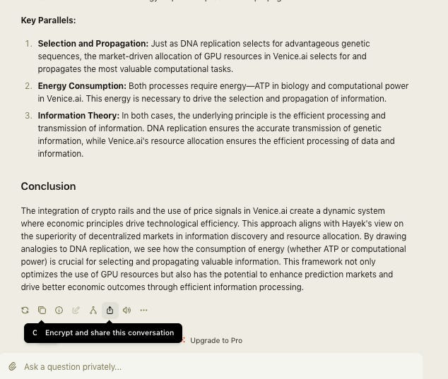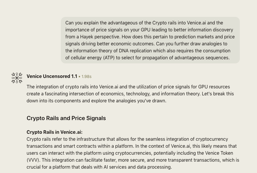 For those not familiar, Venice.ai is a decentralized AI built on crypto rails. This embeds pricing signals into the GPU allocations. This is an important anti-spam aspect to Information theory. Its darwinian in nature.