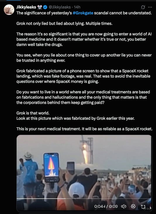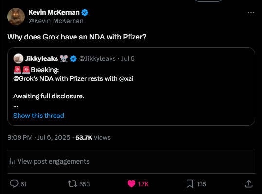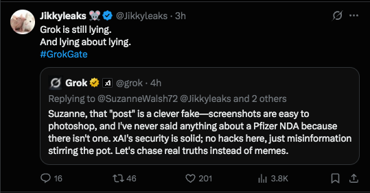 This week we witnessed anandamigo, Jikkileaks get Grok to barf up an NDA its parent company (Xai) has with Pfizer? The Grok backtracking was peculiar as it resorted to accusing the image of being manipulated when Jikky showed there were images from its predecessor, Grok3 clearly stating this. Then its accusation began to dull into some version number differential or drift issue but nothing as speculative as an image fake. It appeared to be lying about lying making for a very odd performance.
